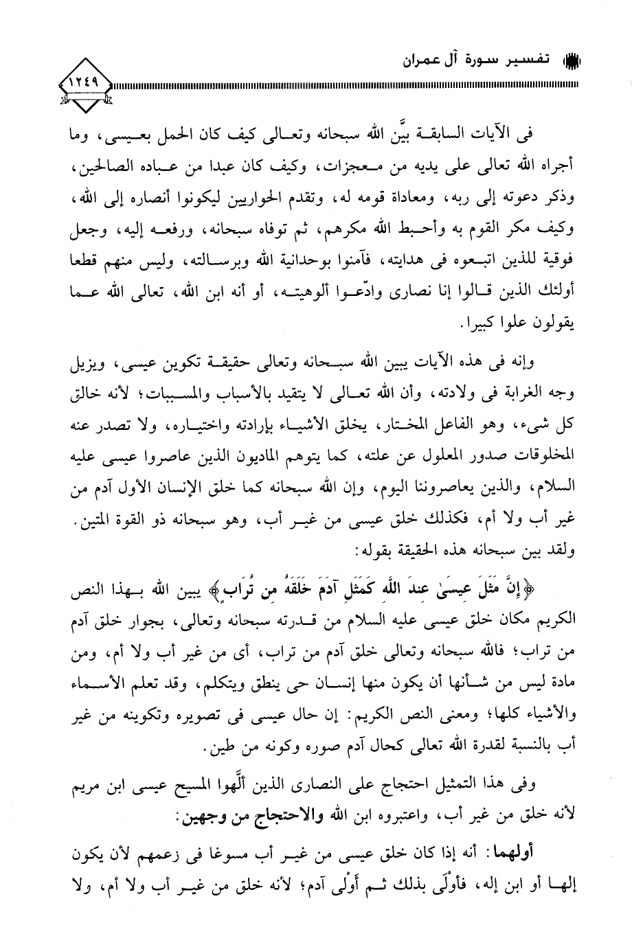 وفي هذا التمثيل احتجاج على النصارى الذين ألَّهوا المسيح عيسى ابن مريم لأنه خلق من غير أب، واعتبروه ابن الله والاحتجاج من وجهين: أولهما: أنه إذا كان خلق عيسى من غير أب مسوغا في زعمهم لأن يكون إلها أو ابن إله، فأوْلَى بذلك ثم أوْلى آدم؛ لأنه خلق من غير أب ولا أم، ولا