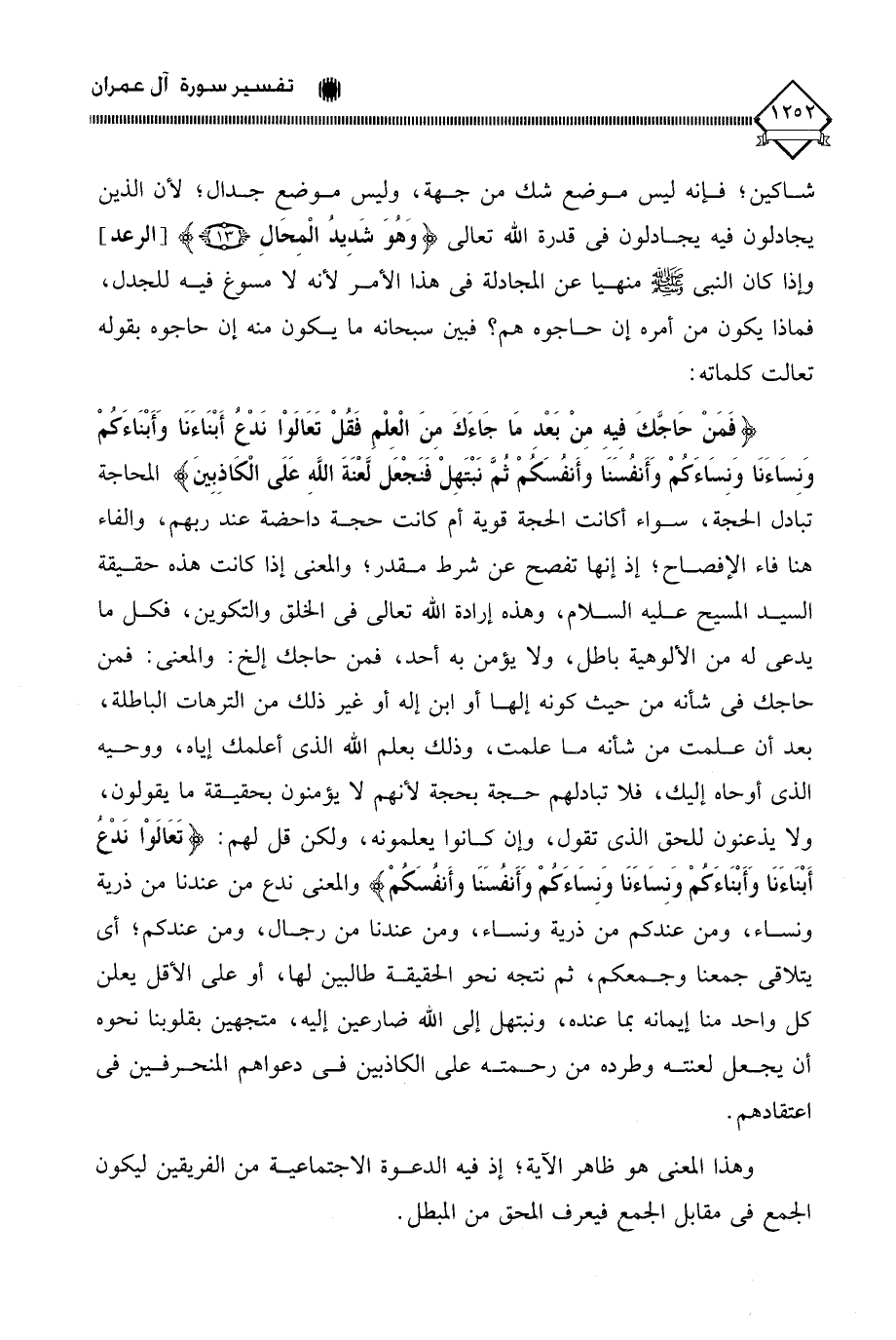 المحاجة تبادل الحجة، سواء أكانت الحجة قوية أم كانت حجة داحضة عند ربهم، والفاء هنا فاء الإفصاح؛ إذ إنها تفصح عن شرط مقدر؛ والمعنى إذا كانت هذه حقيقة السيد المسيح عليه السلام، وهذه إرادة الله تعالى في الخلق والتكوين، فكل ما يدعى له من الألوهية باطل، ولا يؤمن به أحد، فمن حاجك إلخ: والمعنى: فمن حاجك في شأنه من حيث كونه إلها أو ابن إله أو غير ذلك من الترهات الباطلة، بعد أن علمت من شأنه ما علمت، وذلك بعلم الله الذي أعلمك إياه، ووحيه الذي أوحاه إليك، فلا تبادلهم حجة بحجة لأنهم لَا يؤمنون بحقيقة ما يقولون، ولا يذعنون للحق الذي تقول، وإن كانوا يعلمونه، ولكن قل لهم: (تَعَالَوْا نَدْعُ أَبْنَاءَنَا وَأَبْنَاءَكُمْ وَنِسَاءَنَا وَنِسَاءَكُمْ وَأَنْفُسَنَا وَأَنْفُسَكُمْ) والمعنى ندع من عندنا من ذرية ونساء، ومن عندكم من ذرية ونساء، ومن عندنا من رجال، ومن عندكم؛ أي يتلاقى جمعنا وجمعكم، ثم نتجه نحو الحقيقة طالبين لها، أو على الأقل يعلن كل واحد منا إيمانه بما عنده، ونبتهل إلى الله ضارعين إليه، متجهين بقلوبنا نحوه أن يجعل لعنته وطرده من رحمته على الكاذبين في دعواهم المنحرفين في اعتقادهم.