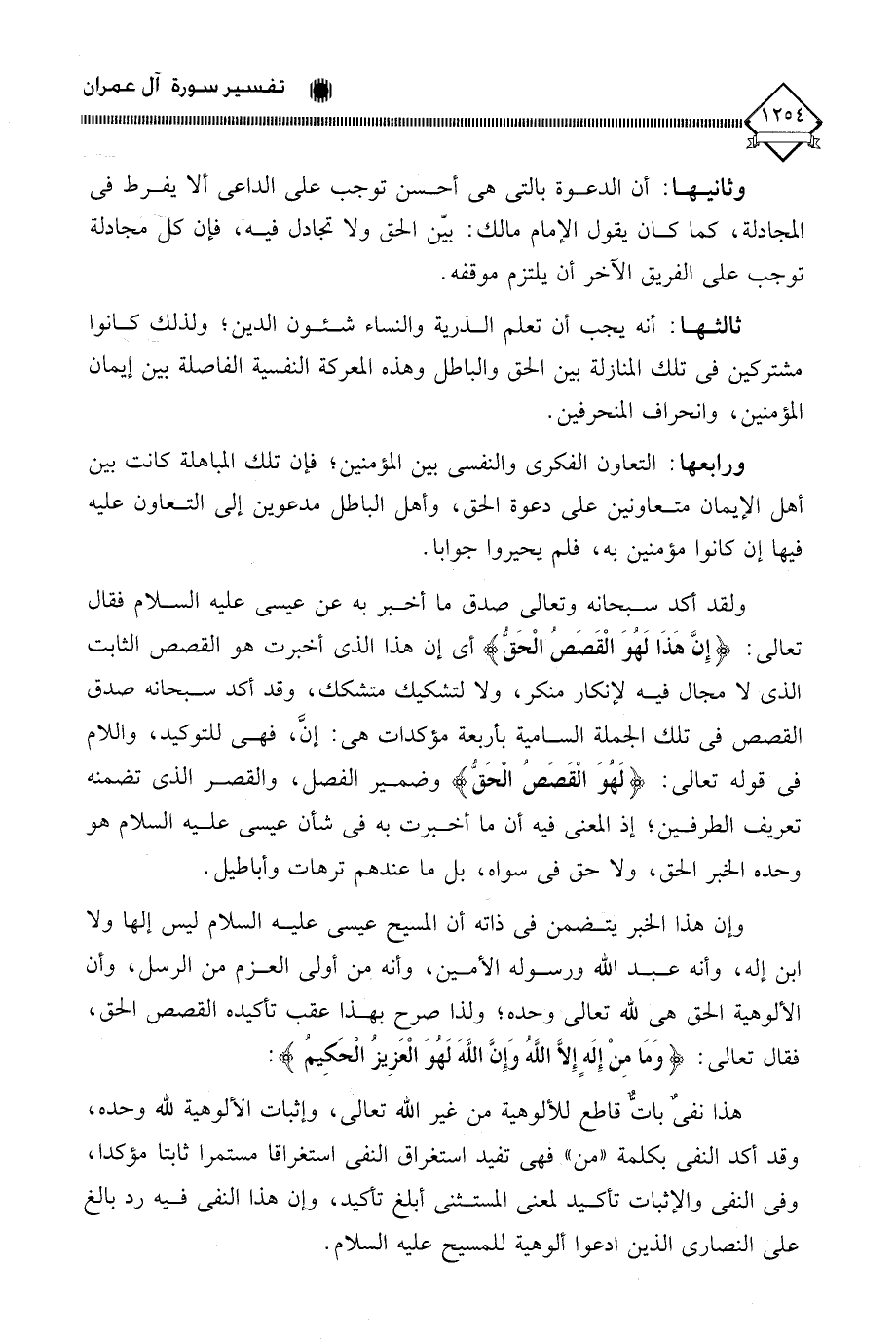أي إن هذا الذي أخبرت هو القصص الثابت الذي لَا مجال فيه لإنكار منكر، ولا لتشكيك متشكك، وقد أكد سبحانه صدق القصص في تلك الجملة السامية بأربعة مؤكدات هي: إنَّ، فهي للتوكيد، واللام في قوله تعالى: (لَهُوَ الْقَصَصُ الْحَقُّ) وضمير الفصل، والقصر الذي تضمنه تعريف الطرفين؛ إذ المعنى فيه أن ما أخبرت به في شأن عيسى عليه السلام هو وحده الخبر الحق، ولا حق في سواه، بل ما عندهم ترهات وأباطيل.