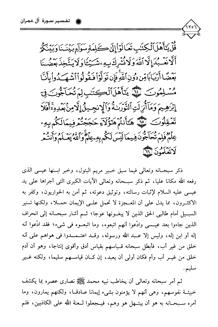 (قُلْ يَا أَهْلَ الْكِتَابِ تَعَالَوْا إِلَى كَلِمَةٍ سَوَاءٍ بَيْنَنَا وَبَيْنَكُمْ أَلَّا نَعْبُدَ إِلَّا اللَّهَ وَلَا نُشْرِكَ بِهِ شَيْئًا وَلَا يَتَّخِذَ بَعْضُنَا بَعْضًا أَرْبَابًا مِنْ دُونِ اللَّهِ فَإِنْ تَوَلَّوْا فَقُولُوا اشْهَدُوا بِأَنَّا مُسْلِمُونَ (64) يَا أَهْلَ الْكِتَابِ لِمَ تُحَاجُّونَ فِي إِبْرَاهِيمَ وَمَا أُنْزِلَتِ التَّوْرَاةُ وَالْإِنْجِيلُ إِلَّا مِنْ بَعْدِهِ أَفَلَا تَعْقِلُونَ (65) هَا أَنْتُمْ هَؤُلَاءِ حَاجَجْتُمْ فِيمَا لَكُمْ بِهِ عِلْمٌ فَلِمَ تُحَاجُّونَ فِيمَا لَيْسَ لَكُمْ بِهِ عِلْمٌ وَاللَّهُ يَعْلَمُ وَأَنْتُمْ لَا تَعْلَمُونَ (66)
