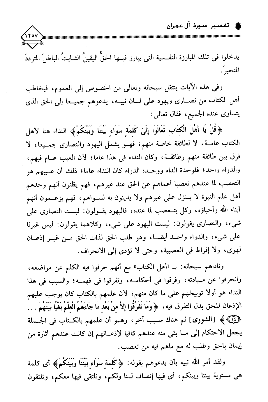 (قُلْ يَا أَهْلَ الْكِتَابِ تَعَالَوْا إِلَى كلِمَة سَوَاء بَيْنَنَا وَبَيْنَكُمْ) النداء هنا لأهل الكتاب عامة، لَا لطائفة خاصة منهم؛ فهو يشمل اليهود والنصارى جميعا، لا فرق بين طائفة منهم وطائفة، وكان النداء في هذا عاما؛ لأن العيب عام فيهم، والدواء واحد؛ فلوحدة الداء ووحدة الدواء كان النداء عاما؛ ذلك أن عيبهم هو التعصب لما عندهم تعصبا أعماهم عن الحق عند غيرهم، فهم يظنون أنهم وحدهم أهل علم النبوة لَا ينزل على غيرهم ولا يدينون به لسواهم، فهم يزعمون أنهم أبناء الله وأحباؤه، وكل يتعصب لما عنده، فاليهود يقولون: ليست النصارى على شيء، والنصارى يقولون: ليست اليهود على شيء، وكلاهما يقولون: ليس غيرنا على شيء، والدواء واحد أيضا، وهو طلب الحق لذات الحق من غير إذعان لهوى، ولا إفراط في العصبية، وحتى لَا تؤدى إلى الانحراف.