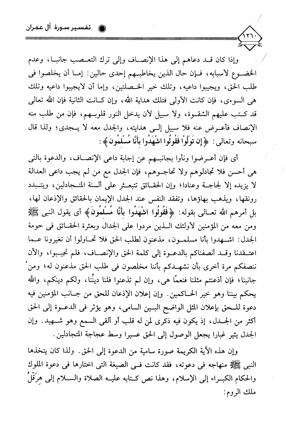 وإن هذه الآية الكريمة صورة سامية من الدعوة إلى الحق. ولذا كان يتخذها النبي - صلى الله عليه وسلم - منهاجه في دعوته، فقد كانت في الصيغة التي اختارها في دعوة الملوك والحكام الكبراء إلى الإسلام، وهذا نص كتابه عليه الصلاة والسلام إلى هِرَقْلُ ملك الروم: