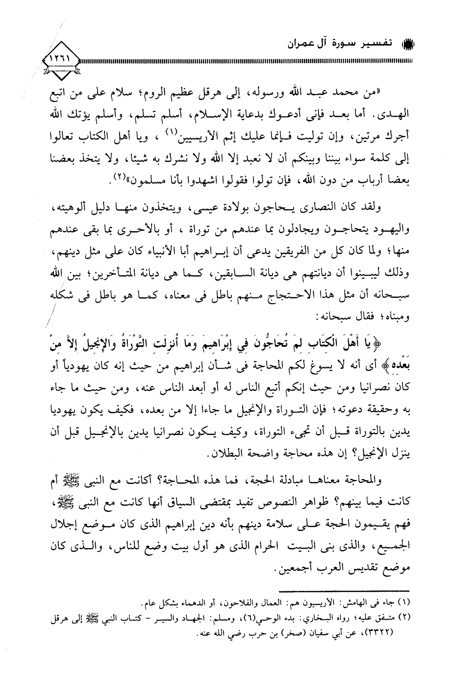 " من محمد عبد الله ورسوله، إلى هرقل عظيم الروم، سلام على من اتبع الهدى. أما بعد فإني أدعوك بدعاية الإسلام، أسلم تسلم، وأسلم يؤتك الله أجرك مرتين، وإن توليت فإنما عليك إثم الأريسيين (¬1)، ويا أهل الكتاب تعالوا إلى كلمة سواء بيننا وبينكم أن لَا نعبد إلا الله ولا نشرك به شيئا، ولا يتخذ بعضنا بعضا أرباب من دون الله، فإن تولوا فقولوا اشهدوا بأنا مسلمون " (¬2).