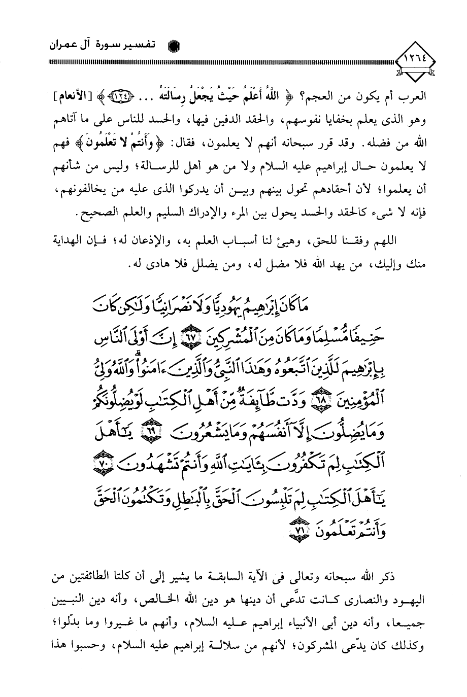 (مَا كَانَ إِبْرَاهِيمُ يَهُودِيًّا وَلَا نَصْرَانِيًّا وَلَكِنْ كَانَ حَنِيفًا مُسْلِمًا وَمَا كَانَ مِنَ الْمُشْرِكِينَ (67) إِنَّ أَوْلَى النَّاسِ بِإِبْرَاهِيمَ لَلَّذِينَ اتَّبَعُوهُ وَهَذَا النَّبِيُّ وَالَّذِينَ آمَنُوا وَاللَّهُ وَلِيُّ الْمُؤْمِنِينَ (68) وَدَّتْ طَائِفَةٌ مِنْ أَهْلِ الْكِتَابِ لَوْ يُضِلُّونَكُمْ وَمَا يُضِلُّونَ إِلَّا أَنْفُسَهُمْ وَمَا يَشْعُرُونَ (69) يَا أَهْلَ الْكِتَابِ لِمَ تَكْفُرُونَ بِآيَاتِ اللَّهِ وَأَنْتُمْ تَشْهَدُونَ (70) يَا أَهْلَ الْكِتَابِ لِمَ تَلْبِسُونَ الْحَقَّ بِالْبَاطِلِ وَتَكْتُمُونَ الْحَقَّ وَأَنْتُمْ تَعْلَمُونَ (71)
