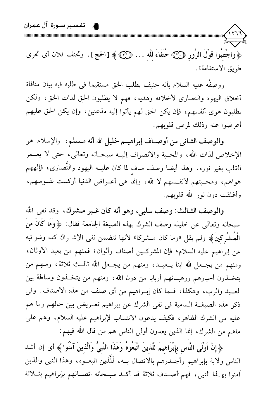 والوصف الثالث: وصف سلبي، وهو أنه كان غير مشرك، وقد نفَى الله سبحانه وتعالى عن خليله وصف الشرك بهذه الصيغة الجامعة فقال: (وَمَا كَانَ مِنَ الْمُشْركِينَ) ولم يقل " وما كان مشركا " لأنها تتضمن نفي الإشراك كله وشوائبه عن إبراهيم عليه السلام، فإن المشركين أصناف وألوان، فمنهم من يعبد الأوثان، ومنهم من يجعل لله ابنا يعبد، ومنهم من يجعل الله ثالث ثلاثة، ومنهم من يتخذون أحبارهم ورهبانهم أربابا من دون الله، ومنهم من يتخذون وساطة بين العبد والرب، وهكذا، فما كان إبراهيم من أي صنف من هذه الأصناف. وفي ذكر هذه الصيغة السامية في نفي الشرك عن إبراهيم تعريض بين حالهم وما هم عليه من الشرك الظاهر، فكيف يدعون الانتساب لإبراهيم عليه السلام، وهم على ما هم من الشرك، إنما الذين يعدون أولى الناس هم من قال الله فيهم:
