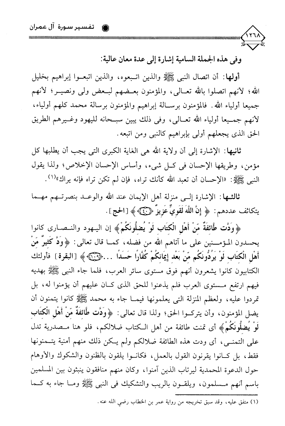 أولها: أن اتصال النبي - صلى الله عليه وسلم - والذين اتبعوه، والذين اتبعوا إبراهيم بخليل الله، لأنهم اتصلوا بالله تعالى، والمؤمنون بعضهم لبعض ولي ونصير، لأنهم جميعا أولياء الله. فالمؤمنون برسالة إبراهيم والمؤمنون برسالة محمد كلهم أولياء، لأنهم جميعا أولياء الله تعالى، وفي ذلك يبين سبحانه لليهود وغيرهم الطريق الحق الذي يجعلهم أولى بإبراهيم كالنبي ومن اتبعه.