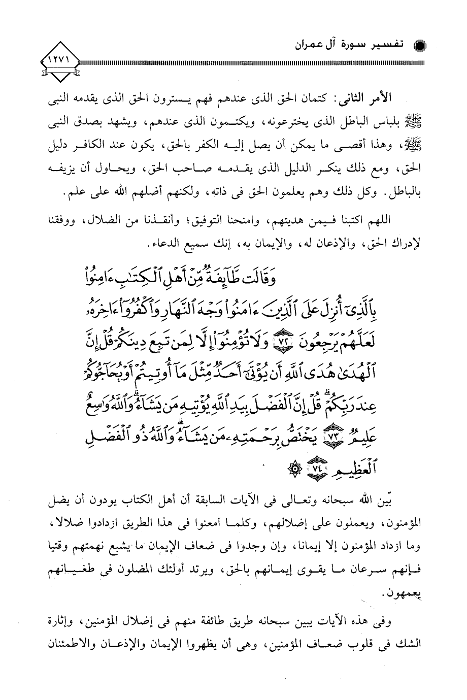 (وَقَالَتْ طَائِفَةٌ مِنْ أَهْلِ الْكِتَابِ آمِنُوا بِالَّذِي أُنْزِلَ عَلَى الَّذِينَ آمَنُوا وَجْهَ النَّهَارِ وَاكْفُرُوا آخِرَهُ لَعَلَّهُمْ يَرْجِعُونَ (72) وَلَا تُؤْمِنُوا إِلَّا لِمَنْ تَبِعَ دِينَكُمْ قُلْ إِنَّ الْهُدَى هُدَى اللَّهِ أَنْ يُؤْتَى أَحَدٌ مِثْلَ مَا أُوتِيتُمْ أَوْ يُحَاجُّوكُمْ عِنْدَ رَبِّكُمْ قُلْ إِنَّ الْفَضْلَ بِيَدِ اللَّهِ يُؤْتِيهِ مَنْ يَشَاءُ وَاللَّهُ وَاسِعٌ عَلِيمٌ (73) يَخْتَصُّ بِرَحْمَتِهِ مَنْ يَشَاءُ وَاللَّهُ ذُو الْفَضْلِ الْعَظِيمِ (74)