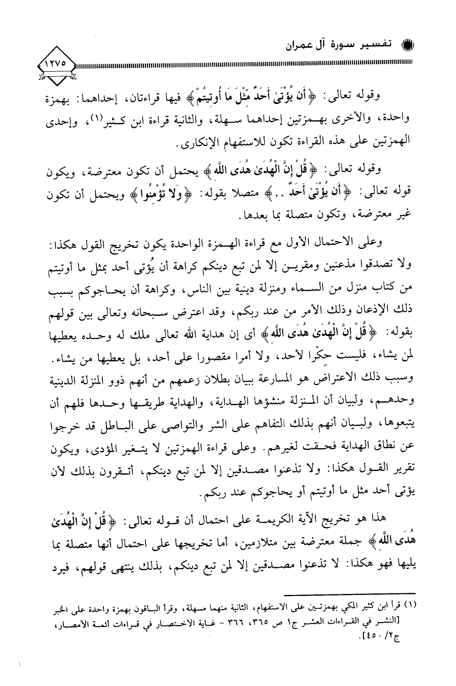 هذا هو تخريج الآية الكريمة على احتمال أن قوله تعالى: (قُلْ إِنَّ الْهُدَى هُدَى اللَّهِ) جملة معترضة بيزا متلازمين، أما تخريجها على احتمال أنها متصلة بما يليها فهو هكذا: لَا تذعنوا مكل مصدقين إلا لمن تبع دينكم، بذلك ينتهي قولهم، فيرد