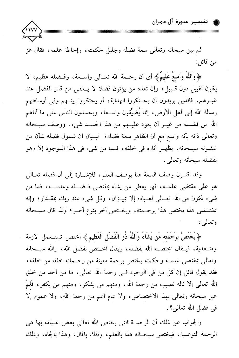 وقد اقترن وصف السعة هنا بوصف العلم، للإشارة إلى أن فضله تعالى هو على مقتضى علمه، فهو يعطي من يشاء بمقتضى فضله وعلمه، فما من شيء يكون من الله تعالى لعباده إلا بميزان، وكل شيء عند ربك بمقدار؛ وإنه بمقتضى هذا يختص هذا برحمته، ويختص آخر بنوع آخر؛ ولذا قال سبحانه وتعالى: