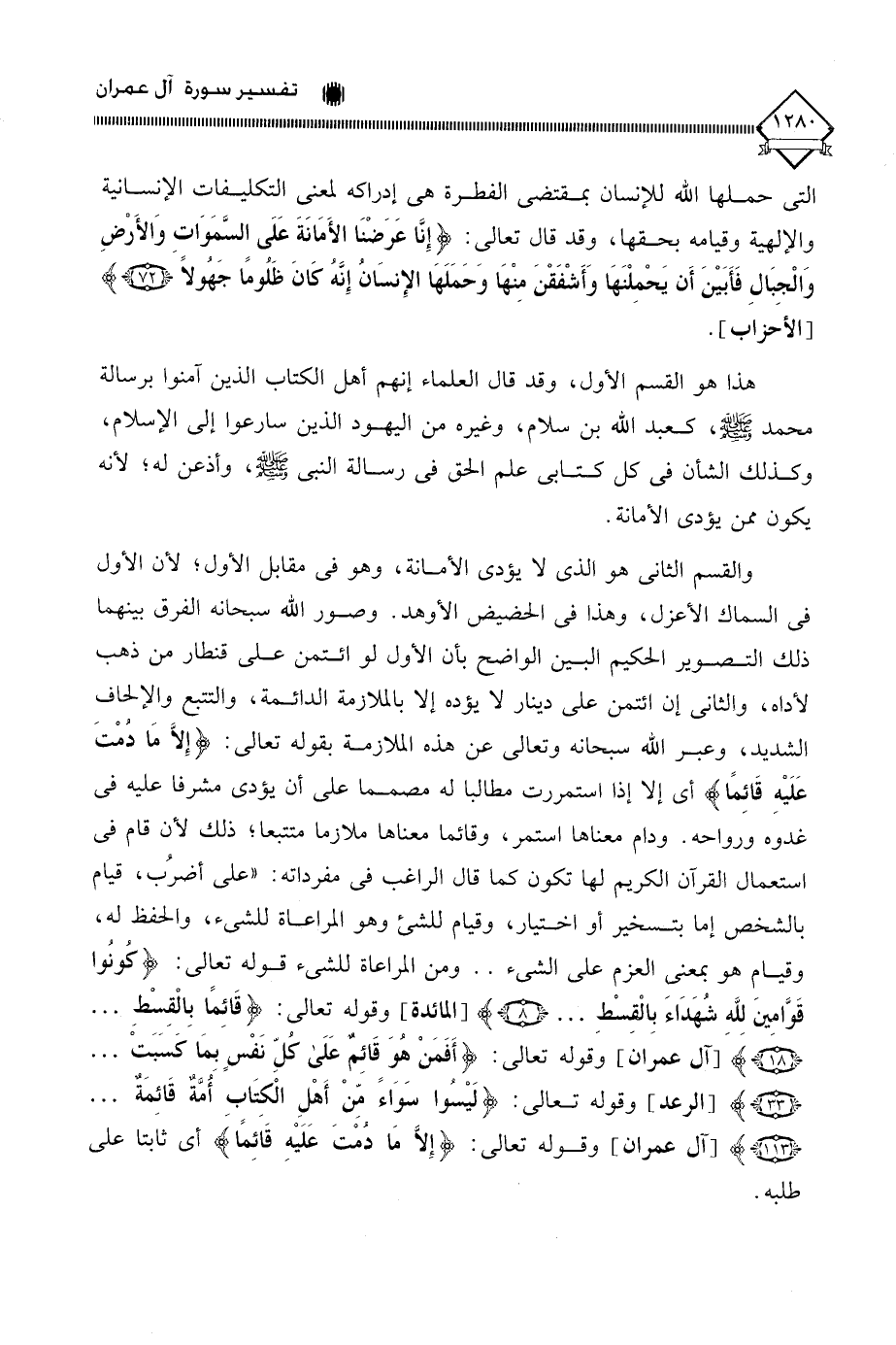 والقسم الثاني هو الذي لَا يؤدي الأمانة، وهو في مقابل الأول؛ لأن الأول في السماك الأعزل، وهذا في الحضيض الأوهد. وصور الله سبحانه الفرق بينهما ذلك التصوير الحكيم البين الواضح بأن الأول لو ائتمن على قنطار من ذهب لأداه، والثاني إن ائتمن على دينار لَا يؤده إلا بالملازمة الدائمة، والتتبع والإلحاف الشديد، وعبر الله سبحانه وتعالى عن هذه الملازمة بقوله تعالى: (إِلَّا مَا دُمْتَ عَلَيْهِ قَائِمًا) أي إلا إذا استمررت مطالبا له مصمما على أن يؤدى مشرفا عليه في غدوه ورواحه. ودام معناها استمر، وقائما معناها ملازما متتبعا؛ ذلك لأن قام في استعمال القرآن الكريم لها تكون كما قال الراغب في مفرداته: " على أضرُب، قيام بالشخص إما بتسخير أو اختيار، وقيام للشيء وهو المراعاة للشيء، والحفظ له، وقيام هو بمعنى العزم على الشيء. . ومن المراعاة للشيء قوله تعالى: (كُونُوا قَوَّامينَ للَّه شُهَدَاءَ بِالْقِسْطِ. . .)، وقوله تعالى: (قَائِمًا بِالْقِسْطِ. . .)، وقوله تعالى: (أَفَمَنْ هُوَ قَائِم عَلَى كُلِّ نَفْسٍ بِمَا كَسَبَتْ. . .)، وقوله تعالى: (لَيْسُوا سَوَاءً مِّنْ أَهْلِ الْكِتَاب أُمَّةٌ قَائِمَةٌ. . .)، وقوله تعالى: (إِلَّا مَا دُمْتَ عَلَيْهِ قَائِمًا) أي ثابتا على طلبه.