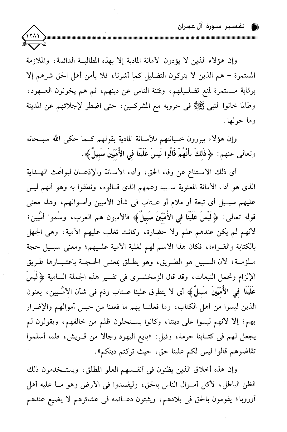 أي ذلك الامتناع عن وفاء الحق، وأداء الأمانة والإذعان لبواعث الهداية الذي هو أداء الأمانة المعنوية سببه زعمهم الذي قالوه، ونطقوا به وهو أنهم ليس عليهم سبيل أي تبعة أو ملام أو عتاب في شأن الأميين وأموالهم، وهذا معنى قوله تعالى: (لَيْسَ عَلَيْنَا فِي الأُمِّيِّينَ سَبِيلٌ) فالأميون هم العرب، وليسوا أمِّيين، لأنهم لم يكن عندهم علم ولا حضارة، وكانت تغلب عليهم الأمية، وهي الجهل بالكتابة والقراءة، فكان هذا الاسم لهم لغلبة الأمية عليهم، ومعنى سبيل حجة ملزمة؛ لأن السبيل هو الطريق، وهو يطلق بمعنى الحجة باعتبارها طريق الإلزام وتحمل التبعات، وقد قال الزمخشري في تفسير هذه الجملة السامية (لَيْسَ عَلَيْنَا فِي الأُمِّيِّينَ سَبِيلٌ) أي لَا يتطرق علينا عتاب وذم في شأن الأمِّيين، يعنون الذين ليسوا من أهل الكتاب، وما فعلنا بهم ما فعلنا من حبس أموالهم والإضرار بهم، إلا لأنهم ليسوا على ديننا، وكانوا يستحلون ظلم من خالفهم، ويقولون لم يجعل لهم في كتابنا حرمة، وقيل: " بايع اليهود رجالا من قريش، فلما أسلموا تقاضوهم قالوا ليس لكم علينا حق، حيث تركتم دينكم ".