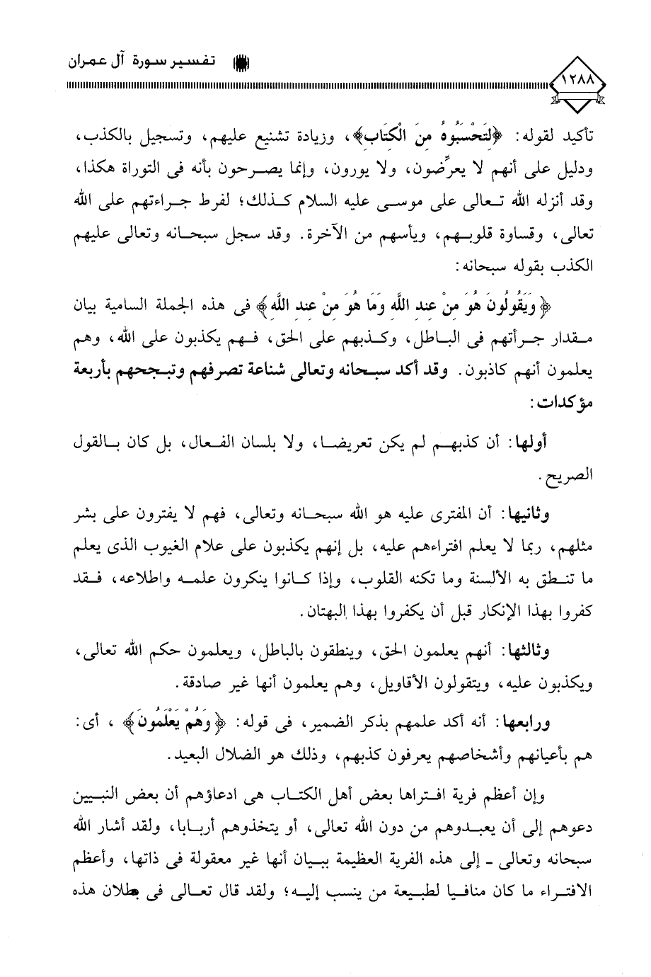 وثالثها: أنهم يعلمون الحق، وينطقون بالباطل، ويعلمون حكم الله تعالى، ويكذبون عليه، ويتقولون الأقاويل، وهم يعلمون أنها غير صادقة.