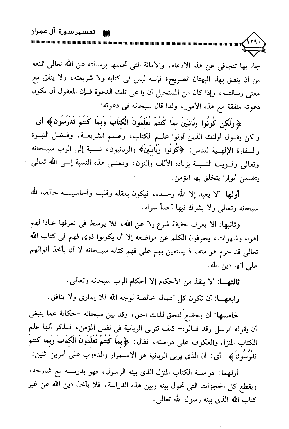 خامسها: أن يخضع للحق لذات الحق، وقد بين سبحانه - حكاية عما ينبغي أن يقوله الرسل وقد قالوه - كيف تتربى الربانية في نفس المؤمن، فذكر أنها علم الكتاب المنزل والعكوف على دراسته، فقال: (بِمَا كنتمْ تُعَلِّمُونَ الْكِتَابَ وَبِمَا كنتمْ تَدْرُسُونَ). أي: أن الذي يربي الربانية هو الاستمرار والدءوب على أمرين اثنين: أولهما: دراسة الكتاب المنزل الذي بينه الرسول، فهو يدرسه مع شارحه، ويقطع كل الحجزات التي تحول بينه وبين هذه الدراسة، فلا يأخذ دين الله عن غير كتاب الله الذي بينه رسول الله تعالى.