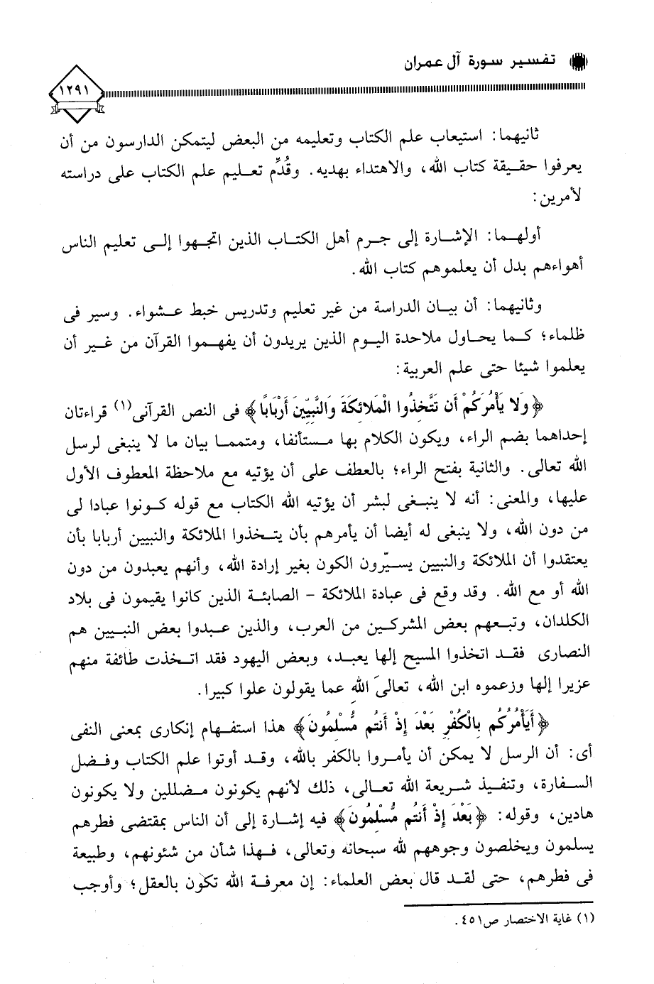في النص القرآني (¬1) قراءتان إحداهما بضم الراء، ويكون الكلام بها مستأنفا، ومتمما بيان ما لَا ينبغي لرسل الله تعالى. والثانية بفتح الراء؛ بالعطف على أن يؤتيه مع ملاحظة المعطوف الأول عليها، والمعنى: أنه لَا ينبغي لبشر أن يؤتيه الله الكتاب مع قوله كونوا عبادا لي من دون الله، ولا ينبغي له أيضا أن يأمرهم بأن يتخذوا الملائكة والنبيين أربابا بأن يعتقدوا أن الملائكة والنبيين يسيّرون الكون بغير إرادة الله، وأنهم يعبدون من دون الله أو مع الله. وقد وقع في عبادة الملائكة - الصابئة الذين كانوا يقيمون في بلاد الكلدان، وتبعهم بعض المشركين من العرب، والذين عبدوا بعض النبيين هم النصارى فقد اتخذوا المسيح إلها يعبد، وبعض اليهود فقد اتخذت طائفة منهم عزيرا إلها وزعموه ابن الله، تعالي اللهِ عما يقولون علوا كبيرا.