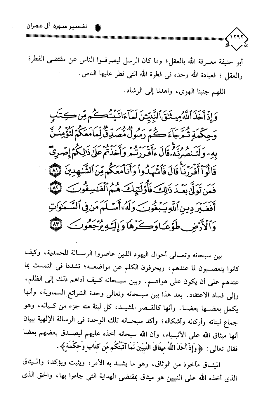 (وَإِذْ أَخَذَ اللَّهُ مِيثَاقَ النَّبِيِّينَ لَمَا آتَيْتُكُمْ مِنْ كِتَابٍ وَحِكْمَةٍ ثُمَّ جَاءَكُمْ رَسُولٌ مُصَدِّقٌ لِمَا مَعَكُمْ لَتُؤْمِنُنَّ بِهِ وَلَتَنْصُرُنَّهُ قَالَ أَأَقْرَرْتُمْ وَأَخَذْتُمْ عَلَى ذَلِكُمْ إِصْرِي قَالُوا أَقْرَرْنَا قَالَ فَاشْهَدُوا وَأَنَا مَعَكُمْ مِنَ الشَّاهِدِينَ (81) فَمَنْ تَوَلَّى بَعْدَ ذَلِكَ فَأُولَئِكَ هُمُ الْفَاسِقُونَ (82) أَفَغَيْرَ دِينِ اللَّهِ يَبْغُونَ وَلَهُ أَسْلَمَ مَنْ فِي السَّمَاوَاتِ وَالْأَرْضِ طَوْعًا وَكَرْهًا وَإِلَيْهِ يُرْجَعُونَ (83)