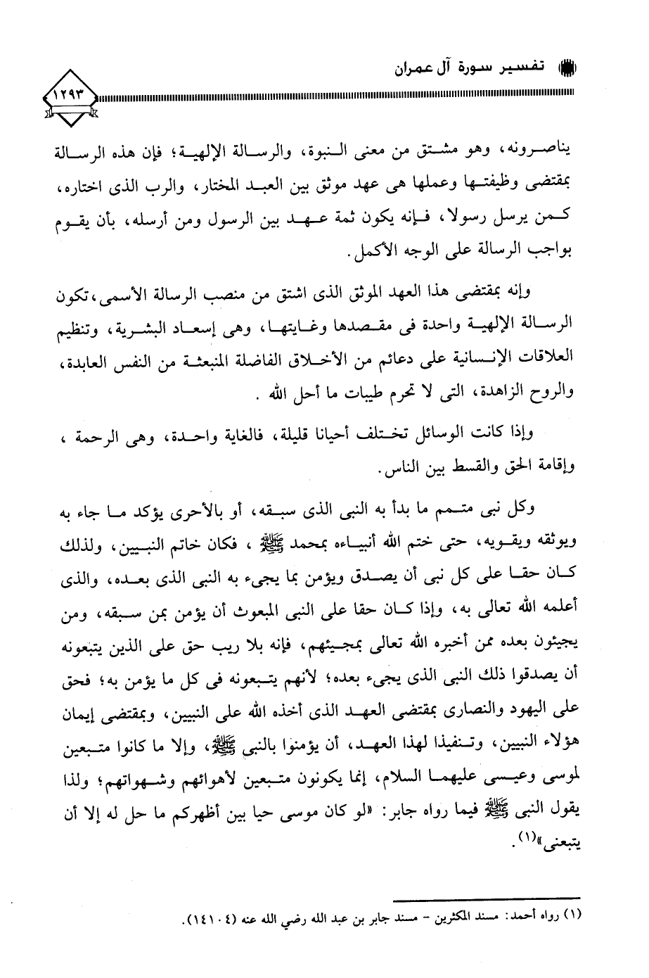وكل نبي متمم ما بدأ به النبي الذي سبقه، أو بالأحرى يؤكد ما جاء به ويوثقه ويقويه، حتى ختم الله أنبياءه بمحمد - صلى الله عليه وسلم -، فكان خاتم النبيين، ولذلك كان حقا على كل نبي أن يصدق ويؤمن بما يجيء به النبي الذي بعده، والذي أعلمه الله تعالى به، وإذا كان حقا على النبي المبعوث أن يؤمن بمن سبقه، ومن يجيئون بعده ممن أخبره الله تعالى بمجيئهم، فإنه بلا ريب حق على الذين يتبعونه أن يصدقوا ذلك النبي الذي يجيء بعده؛ لأنهم يتبعونه في كل ما يؤمن به؛ فحق على اليهود والنصارى بمقتضى العهد الذي أخذه الله على النبيين، وبمقتضى إيمان هؤلاء النبيين، وتنفيذا لهذا العهد، أن يؤمنوا بالنبي - صلى الله عليه وسلم -، وإلا ما كانوا متبعين لموسى وعيسى عليهما السلام، إنما يكونون متبعين لأهوائهم وشهواتهم؛ ولذا يقول النبي - صلى الله عليه وسلم - فيما رواه جابر: " لو كان موسى حيا بين أظهركم ما حل له إلا أن يتبعني " (¬1).