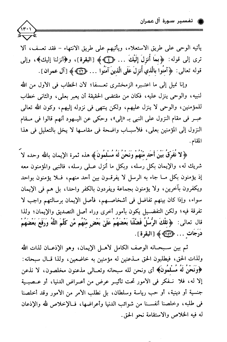 (لا نُفَرِّقُ بَيْنَ أَحَدٍ مِّنْهُمْ وَنَحْنُ لَهُ مُسْلِمُونَ) هذه ثمرة الإيمان بالله وحده لا شريك له، والإيمان بكل رسله، وبكل ما أنزل على رسله، فالنبي والمؤمنون معه إذ يؤمنون بكل ما جاء به الرسل لَا يفرقون بين أحد منهم، فلا يؤمنون بواحد ويكفرون بآخرين، ولا يؤمنون بجماعة ويفردون بالكفر واحدا، بل هم في الإيمان سواء، وإذا كان بينهم تفاضل في أشخاصهم، فاصل الإيمان برسالتهم واجب لا تفرقة فيه؛ ولكن التفضيل يكون بأمور أخرى وراء أصل التصديق والإيمان؛ ولذا قال تعالى: (تِلْكَ الرُّسُلُ فَضَّلْنَا بَعْضَهُمْ عَلَى بَعْضٍ مِنْهُمْ مَنْ كَلَّمَ اللَّهُ وَرَفَعَ بَعْضَهُمْ دَرَجَاتٍ. . .).