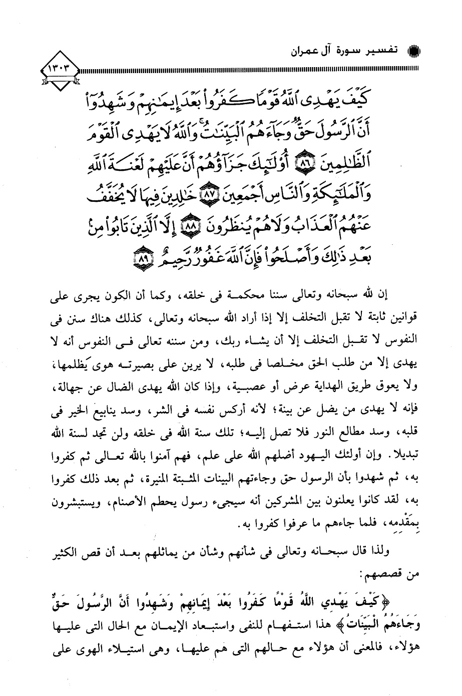 (كَيْفَ يَهْدِي اللَّهُ قَوْمًا كَفَرُوا بَعْدَ إِيمَانِهِمْ وَشَهِدُوا أَنَّ الرَّسُولَ حَقٌّ وَجَاءَهُمُ الْبَيِّنَاتُ وَاللَّهُ لَا يَهْدِي الْقَوْمَ الظَّالِمِينَ (86) أُولَئِكَ جَزَاؤُهُمْ أَنَّ عَلَيْهِمْ لَعْنَةَ اللَّهِ وَالْمَلَائِكَةِ وَالنَّاسِ أَجْمَعِينَ (87) خَالِدِينَ فِيهَا لَا يُخَفَّفُ عَنْهُمُ الْعَذَابُ وَلَا هُمْ يُنْظَرُونَ (88) إِلَّا الَّذِينَ تَابُوا مِنْ بَعْدِ ذَلِكَ وَأَصْلَحُوا فَإِنَّ اللَّهَ غَفُورٌ رَحِيمٌ (89)