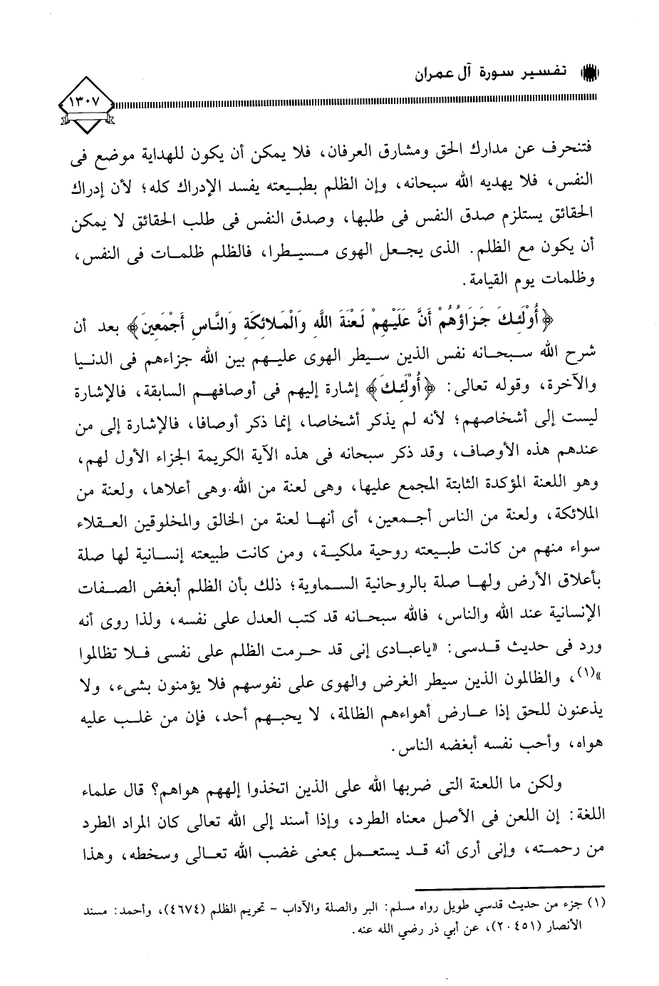 بعد أن شرح الله سبحانه نفس الذين سيطر الهوى عليهم بين الله جزاءهم في الدنيا والآخرة، وقوله تعالى: (أُوْلَئِكَ) إشارة إليهم في أوصافهم السابقة، فالإشارة ليست إلى أشخاصهم؛ لأنه لم يذكر أشخاصا، إنما ذكر أوصافا، فالإشارة إلى من عندهم هذه الأوصاف، وقد ذكر سبحانه في هذه الآية الكريمة الجزاء الأول لهم، وهو اللعنة المؤكدة الثابتة المجمع عليها، وهي لعنة من الله، وهي أعلاها، ولعنة من الملائكة، ولعنة من الناس أجمعين، أي أنها لعنة من الخالق والمخلوقين العقلاء سواء منهم من كانت طبيعته روحية ملكية، ومن كانت طبيعته إنسانية لها صلة بأعلاق الأرض ولها صلة بالروحانية السماوية؛ ذلك بأن الظلم أبغض الصفات الإنسانية عند الله والناس، فالله سبحانه قد كتب العدل على نفسه، ولذا روى أنه ورد في حديث قدسي: " ياعبادي إني قد حرمت الظلم على نفسي فلا تظالموا " (¬1)، والظالمون الذين سيطر الغرض والهوى على نفوسهم فلا يؤمنون بشيء، ولا يذعنون للحق إذا عارض أهواءهم الظالمة، لَا يحبهم أحد، فإن من غلب عليه هواه، وأحب نفسه أبغضه الناس.
