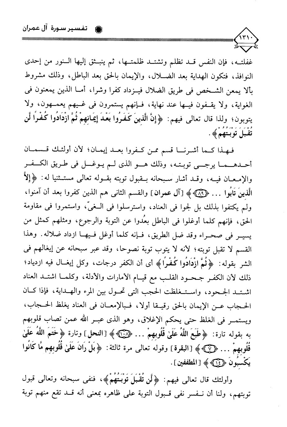 فهذا كما أشرنا قسم ممن كفروا بعد إيمان؛ لأن أولئك قسمان أحدهما يرجى توبته، وذلك هو الذي لم يوغل في طريق الكفر والإمعان فيه، وقد أشار سبحانه بقبول توبته بقوله تعالى مستثنيا له: (إِلَّا الَّذِينَ تَابُواِْ)، والقسم الثاني هم الذين كفروا بعد أن آمنوا، ولم يكتفوا بذلك بل لجوا في العناد، واسترسلوا في الغيّ، واستمروا في مقاومة الحق، فإنهم كلما أوغلوا في الباطل بعُدوا عن التوبة والرجوع، ومثلهم كمثل من يسير في صحراء وقد ضل الطريق، فإنه كلما أوغل فيها ازداد ضلاله. وهذا القسم لَا تقبل توبته، لأنه لَا يتوب توبة نصوحا، وقد عبر سبحانه عن إيغالهم في الشر بقوله: (ثُمَّ ازْدَادُوا كُفْرًا) أي أن الكفر درجات، وكل إيغال فيه ازدياد، ذلك لأن الكفر جحود القلب مع قيام الأمارات والأدلة، وكلما اشتد العناد اشتد الجحود، واستغلظت الحجب التي تحول بين المرء والهداية، فإذا كان الحجاب عن الإيمان بالحق رقيقا أولا، فبالإمعان في العناد يغلظ الحجاب، ويستمر في الغلظ حتى يحكم الإغلاق، وهو الذي عبر الله عمن تصاب قلوبهم به بقوله تارة: (طَبَعَ اللَّهُ عَلَى قُلُوبِهِمْ. . .)، وتارة (خَتَمَ اللَّهُ عَلَى قُلُوبِهِمْ. . .)، وقوله تعالى مرة ثالثة: (بَلْ رَانَ عَلَى قُلُوبِهِم مَّا كَانُوا يَكْسِبُونَ).