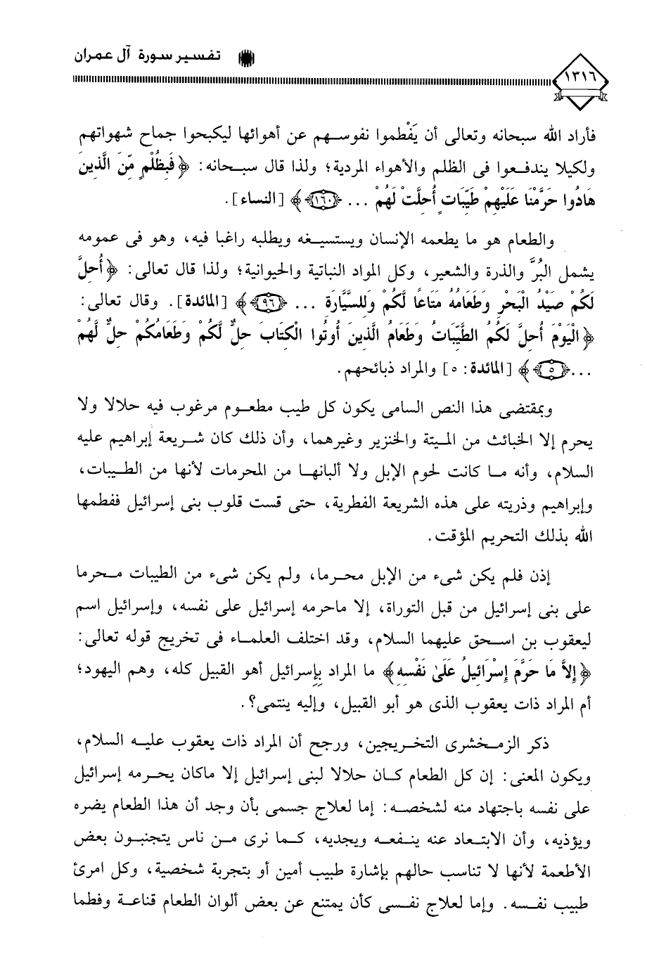 ذكر الزمخشري التخريجين، ورجح أن المراد ذات يعقوب عليه السلام، ويكون المعنى: إن كل الطعام كان حلالا لبني إسرائيل إلا ماكان يحرمه إسرائيل على نفسه باجتهاد منه لشخصه: إما لعلاج جسمي بأن وجد أن هذا الطعام يضره ويؤذيه، وأن الابتعاد عنه ينفعه ويجديه، كما نرى من ناس يتجنبون بعض الأطعمة لأنها لَا تناسب حالهم بإشارة طبيب أمين أو بتجربة شخصية، وكل امرئ طبيب نفسه. وإما لعلاج نفسي كأن يمتنع عن بعض ألوان الطعام قناعة وفطما