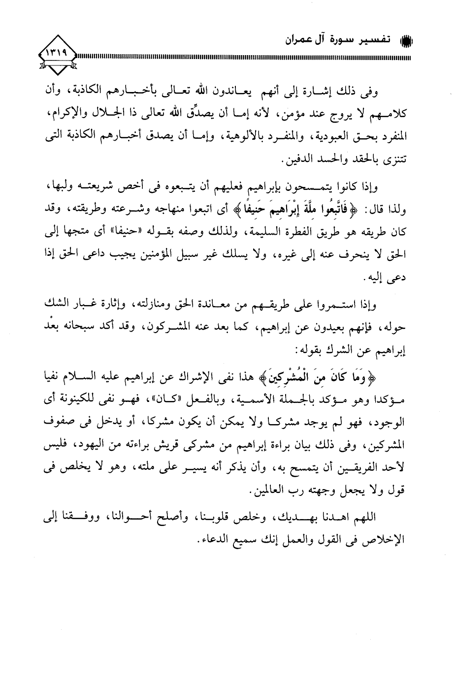 (وَمَا كَانَ مِنَ الْمُشْرِكِينَ) هذا نفي الإشراك عن إبراهيم عليه السلام نفيا مؤكدا وهو مؤكد بالجملة الأسمية، وبالفعل " كان "، فهو نفي للكينونة أي الوجود، فهو لم يوجد مشركا ولا يمكن أن يكون مشركا، أو يدخل في صفوف المشركين، وفي ذلك بيان براءة إبراهيم من مشركي قريش براءته من اليهود، فليس لأحد الفريقين أن يتمسح به، وأن يذكر أنه يسير على ملته، وهو لَا يخلص في قول ولا يجعل وجهته رب العالمين.
