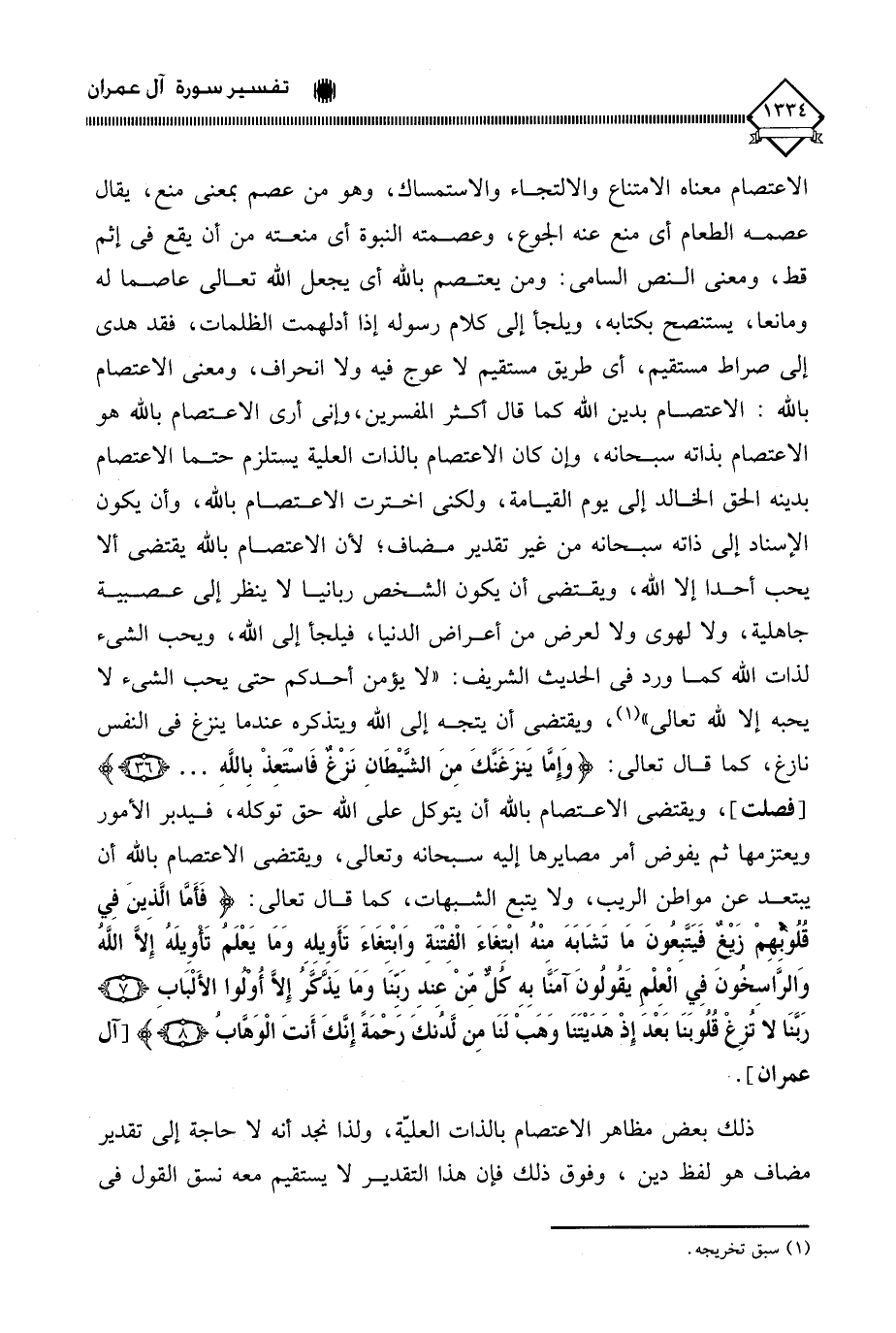 ذلك بعض مظاهر الاعتصام بالذات العليّة، ولذا نجد أنه لَا حاجة إلى تقدير مضاف هو لفظ دين، وفوق ذلك فإن هذا التقدير لَا يستقيم معه نسق القول في