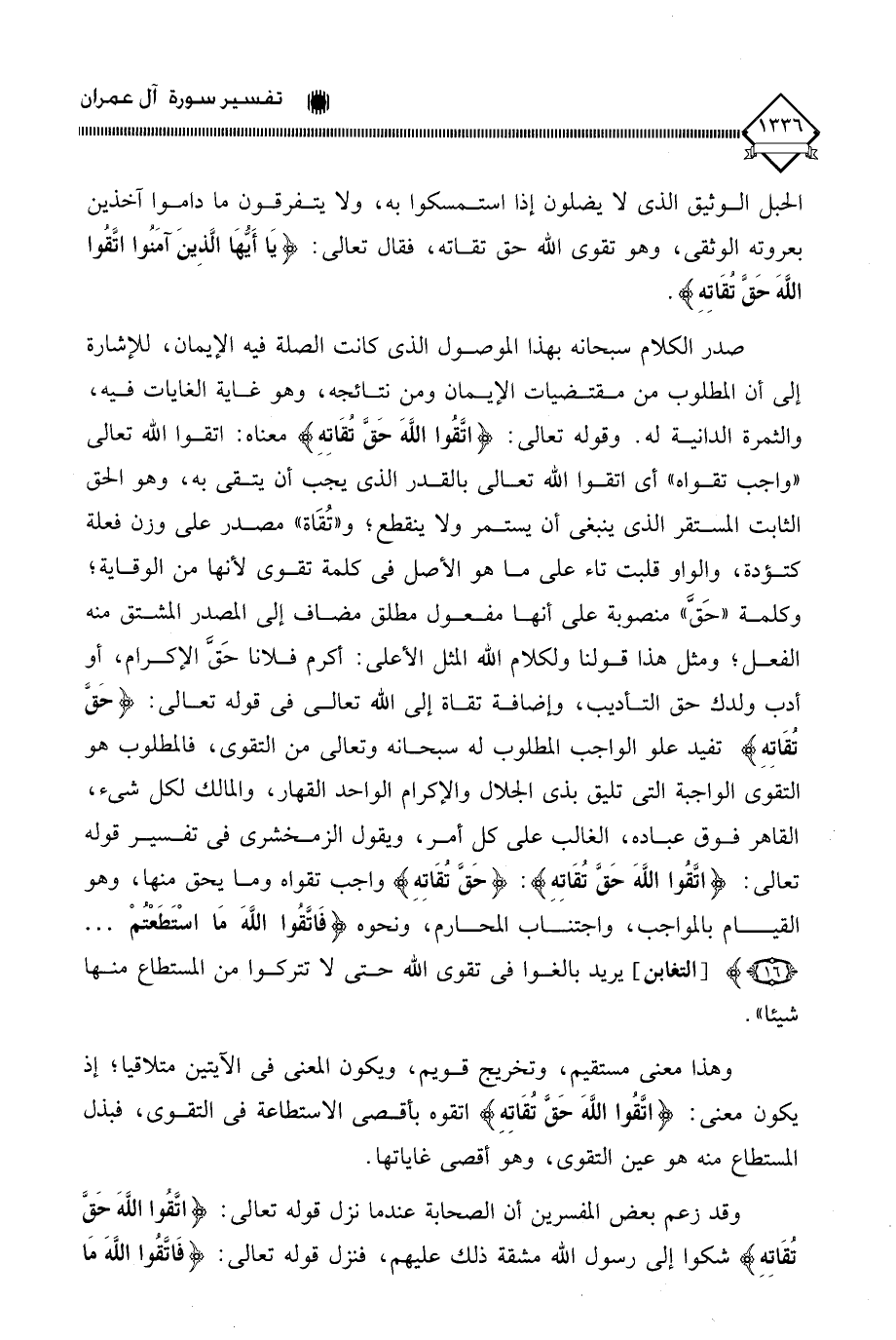 صدر الكلام سبحانه بهذا الموصول الذي كانت الصلة فيه الإيمان، للإشارة إلى أن المطلوب من مقتضيات الإيمان ومن نتائجه، وهو غاية الغايات فيه، والثمرة الدانية له. وقوله تعالى: (اتَّقُوا اللَّهَ حَقَّ تُقَاتِهِ) معناه: اتقوا الله تعالى " واجب تقواه " أي اتقوا الله تعالى بالقدر الذي يجب أن يتقى به، وهو الحق الثابت المستقر الذي ينبغي أن يستمر ولا ينقطع، و " تُقَاة " مصدر على وزن فعلة كتؤدة، والواو قلبت تاء على ما هو الأصل في كلمة تقوى لأنها من الوقاية؛ وكلمة " حَقَّ " منصوبة على أنها مفعول مطلق مضاف إلى المصدر المشتق منه الفعل، ومثل هذا قولنا ولكلام الله المثل الأعلى: أكرم فلانا حَقَّ الإكرام، أو أدب ولدك حق التأديب، وإضافة تقاة إلى الله تعالى في قوله تعالى: (حَقَّ تُقَاتِهِ) تفيد علو الواجب المطلوب له سبحانه وتعالى من التقوى، فالمطلوب هو التقوى الواجبة التي تليق بذي الجلال والإكرام الواحد القهار، والمالك لكل شيء، القاهر فوق عباده، الغالب على كلِ أمر، ويقول الزمخشري في تفسير قوله تعالى: (اتَّقُوا اللَّهَ حَقَّ تُقَاتِهِ): (حقَّ تُقَاتِهِ) واجب تقواه وما يحق منها، وهو القيام بالمواجب، واجتناب المحارم، ونحوه (فَاتَّقُوا اللَّهَ مَا اسْتَطَعْتُمْ. . .)، يريد بالغوا في تقوى الله حتى لَا تتركوا من المستطاع منها شيئا.