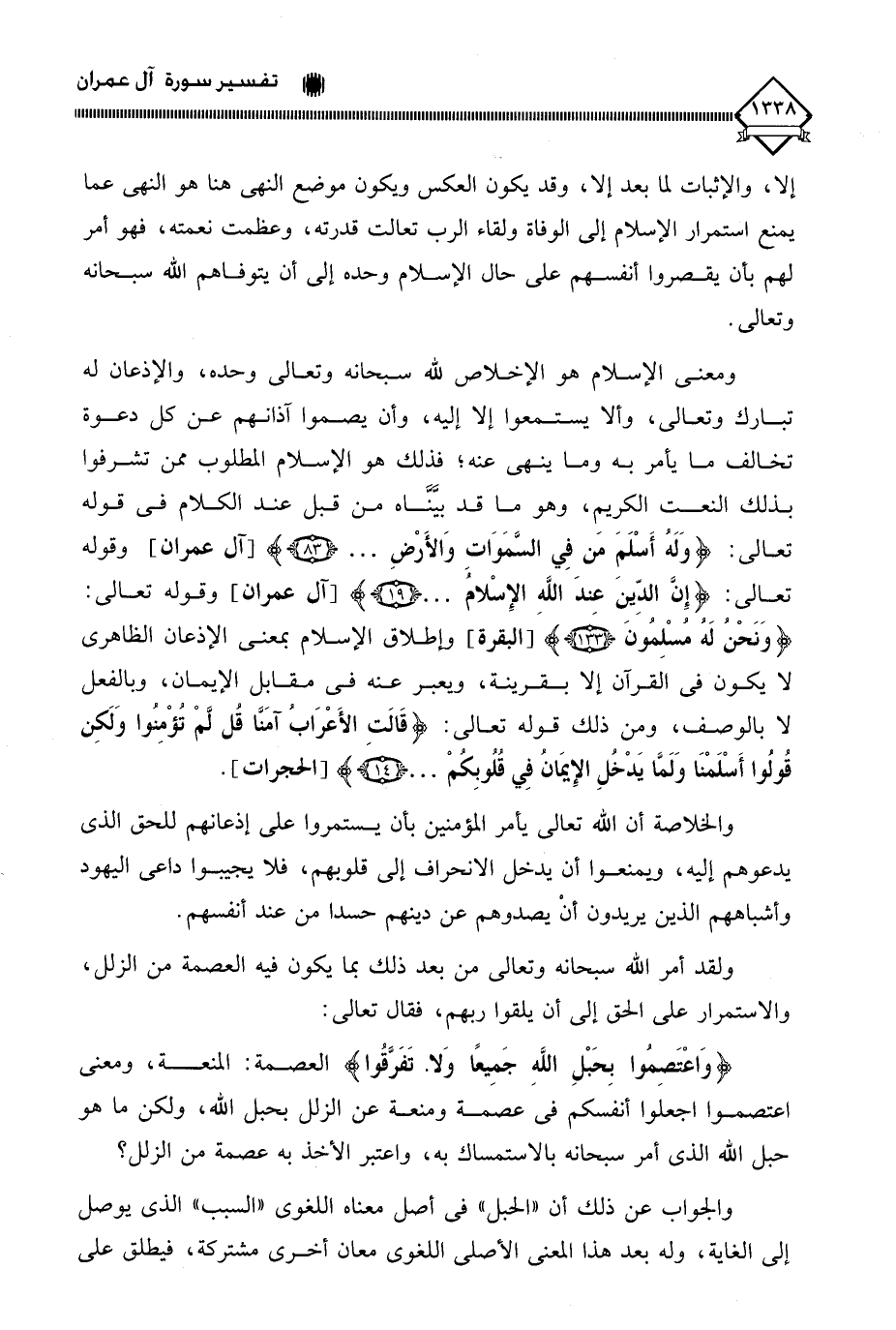 العصمة: المنعة، ومعنى اعتصموا اجعلوا أنفسكم في عصمة ومنعة عن الزلل بحبل الله، ولكن ما هو حبل الله الذي أمر سبحانه بالاستمساك به، واعتبر الأخذ به عصمة من الزلل؟ والجواب عن ذلك أن " الحبل " في أصل معناه اللغوي " السبب " الذي يوصل إلى الغاية، وله بعد هذا المعنى الأصلي اللغوي معان أخرى مشتركة، فيطلق على