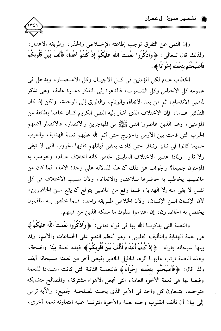 الخطاب عام لكل المؤمنين في كل الأجيال وكل الأعصار، ويدخل في عمومه كل الأجناس وكل الشعوب، فالدعوة إلى التذكر دعوة عامة، وهي تذكر لماضي الانقسام، ثم من بعد الاتفاق والوئام، والطريق إلى الوحدة، ولكن إذا كان التذكير عاما، فإن الاختلاف الذي أشار إليه النص الكريم كان خاصا بطائفة من المؤمنين، وهم الذين عاصروا النبي - صلى الله عليه وسلم - من المهاجرين والأنصار، فالأنصار أكلتهم الحرب التي قامت بين الأوس والخزرج حتى أتم الله عليهم نعمة الهداية، والعرب جميعا كانوا في تنابز وتنافر حتى كادت بعض قبائلهم تفنيها الحروب التي لَا تبقي ولا تذر. ولماذا اعتبر الاختلاف السابق الخاص كأنه اختلاف عام، وخوطب به المؤمنون جميعا؟ والجواب عن ذلك أن هذا للدلالة على وحدة الأمة، فما كان من ماضيها يخاطب به حاضرها للاعتبار والاتعاظ، ولأن سبب الاختلاف في كل نفس لَا يقي منه إلا الهداية، فما وقع من الماضين يتوقع أن يقع من الحاضرين، لأن الإنسان ابن الإنسان، ولأن الخلاص طريقه واحد، فما خلص به الماضون يخلص به الحاضرون، إن اعتزموا سلوك ما سلكه الذين من قبلهم.