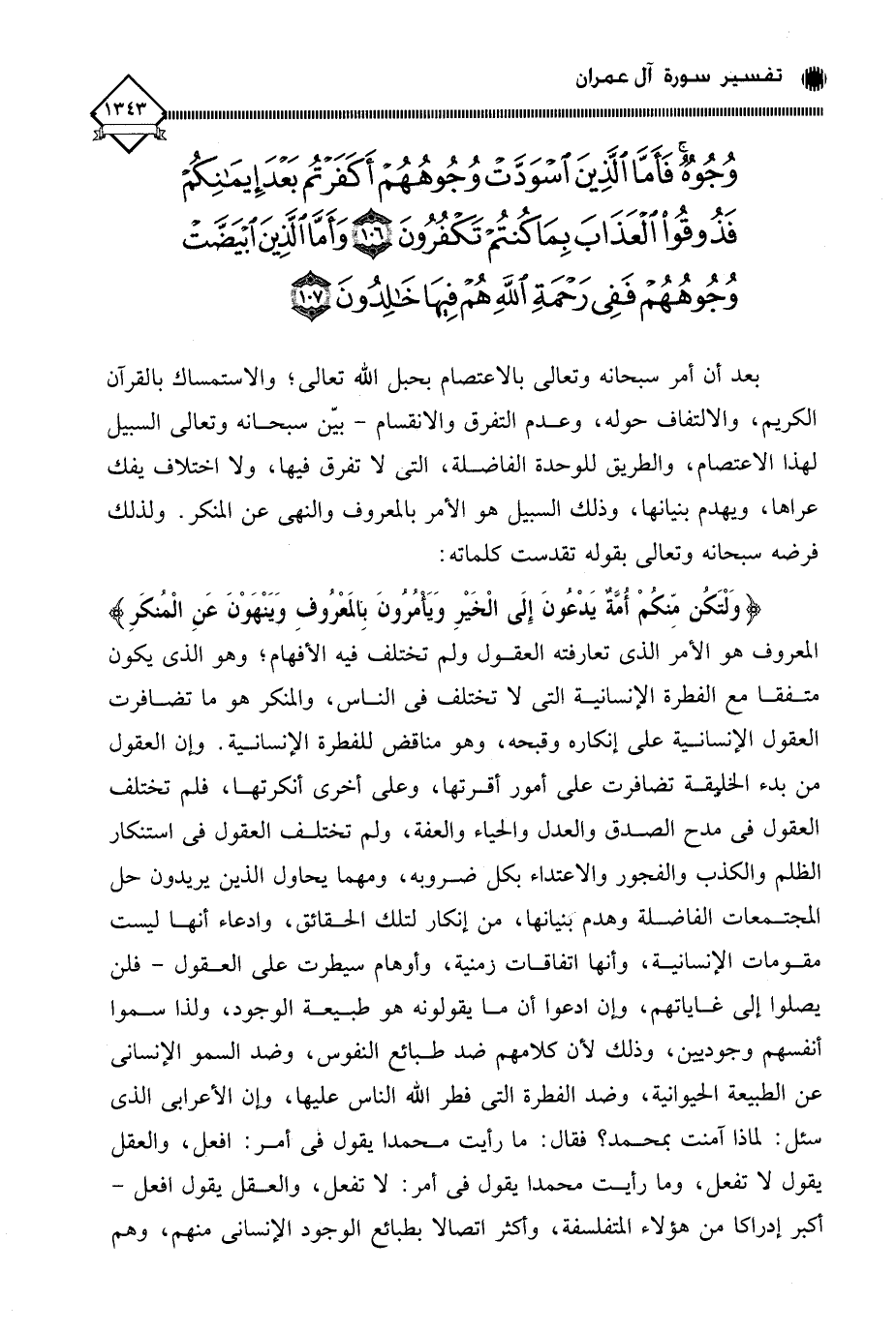 (وَلْتَكُن مِّنكُمْ أُمَّةٌ يَدْعُونَ إِلَى الْخَيْرِ وَيَأمُرُونَ بالمَعْرُوفِ وَيَنْهَوْنَ عَنِ الْمُنكَرِ) المعروف هو الأمر الذي تعارفته العقول ولم تختلف فيه الأفهام؛ وهو الذي يكون متفقا مع الفطرة الإنسانية التي لَا تختلف في الناس، والمنكر هو ما تضافرت العقول الإنسانية على إنكاره وقبحه، وهو مناقض للفطرة الإنسانية. وإن العقول من بدء الخليقة تضافرت على أمور أقرتها، وعلى أخرى أنكرتها، فلم تختلف العقول في مدح الصدق والعدل والحياء والعفة، ولم تختلف العقول في استنكار الظلم والكذب والفجور والاعتداء بكل ضروبه، ومهما يحاول الذين يريدون حل المجتمعات الفاضلة وهدم بنيانها، من إنكار لتلك الحقائق، وادعاء أنها ليست مقومات الإنسانية، وأنها اتفاقات زمنية، وأوهام سيطرت على العقول - فلن يصلوا إلى غاياتهم، وإن ادعوا أن ما يقولونه هو طبيعة الوجود، ولذا سموا أنفسهم وجوديين، وذلك لأن كلامهم ضد طبائع النفوس، وضد السمو الإنساني عن الطبيعة الحيوانية، وضد الفطرة التي فطر الله الناس عليها، وإن الأعرابي الذي سئل: لماذا آمنت بمحمد؛ فقال: ما رأيت محمدا يقول في أمر: افعل، والعقل يقول لَا تفعل، وما رأيت محمدا يقول في أمر: لَا تفعل، والعقل يقول افعل - أكبر إدراكا من هؤلاء المتفلسفة، وأكثر اتصالا بطبائع الوجود الإنساني منهم، وهم