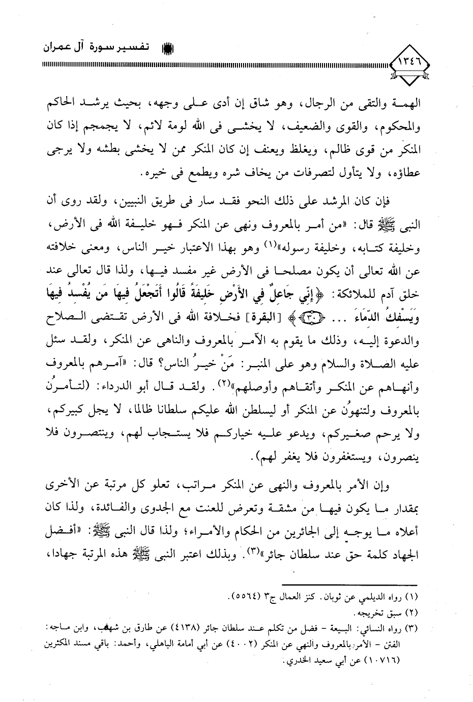 وإن الأمر بالمعروف والنهي عن المنكر مراتب، تعلو كل مرتبة عن الأخرى بمقدار ما يكون فيها من مشقة وتعرض للعنت مع الجدوى والفائدة، ولذا كان أعلاه ما يوجه إلى الجائرين من الحكام والأمراء؛ ولذا قال النبي - صلى الله عليه وسلم -: " أفضل الجهاد كلمة حق عند سلطان جائر " (¬3). وبذلك اعتبر النبي - صلى الله عليه وسلم - هذه المرتبة جهادا،