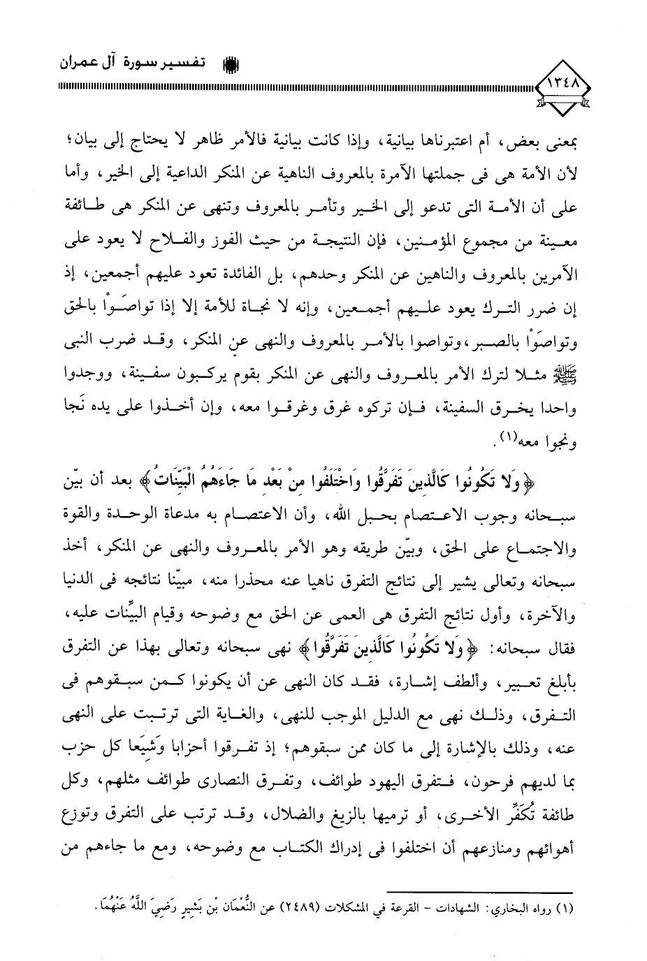 بمعنى بعض؛ أم اعتبرناها بيانية، وإذا كانت بيانية فالأمر ظاهر لَا يحتاج إلى بيان؛ لأن الأمة هي في جملتها الآمرة بالمعروف الناهية عن المنكر الداعية إلى الخير، وأما على أن الأمة التي تدعو إلى الخير وتأمر بالمعروف وتنهى عن المنكر هي طائفة معينة من مجموع المؤمنين، فإن النتيجة من حيث الفوز والفلاح لَا يعود على الآمرين بالمعروف والناهين عن المنكر وحدهم، بل الفائدة تعود عليهم أجمعين، إذ إن ضرر الترك يعود عليهم أجمعين، وإنه لَا نجاة للأمة إلا إذا تواصَوْا بالحق وتواصَوْا بالصبر، وتواصوا بالأمر بالمعروف والنهي عن المنكر، وقد ضرب النبي - صلى الله عليه وسلم - مثلا لترك الأمر بالمعروف والنهي عن المنكر بقوم يركبون سفينة، ووجدوا واحدا يخرق السفينة، فإن تركوه غرق وغرقوا معه، وإن أخذوا على يده نَجا ونجوا معه (¬1).