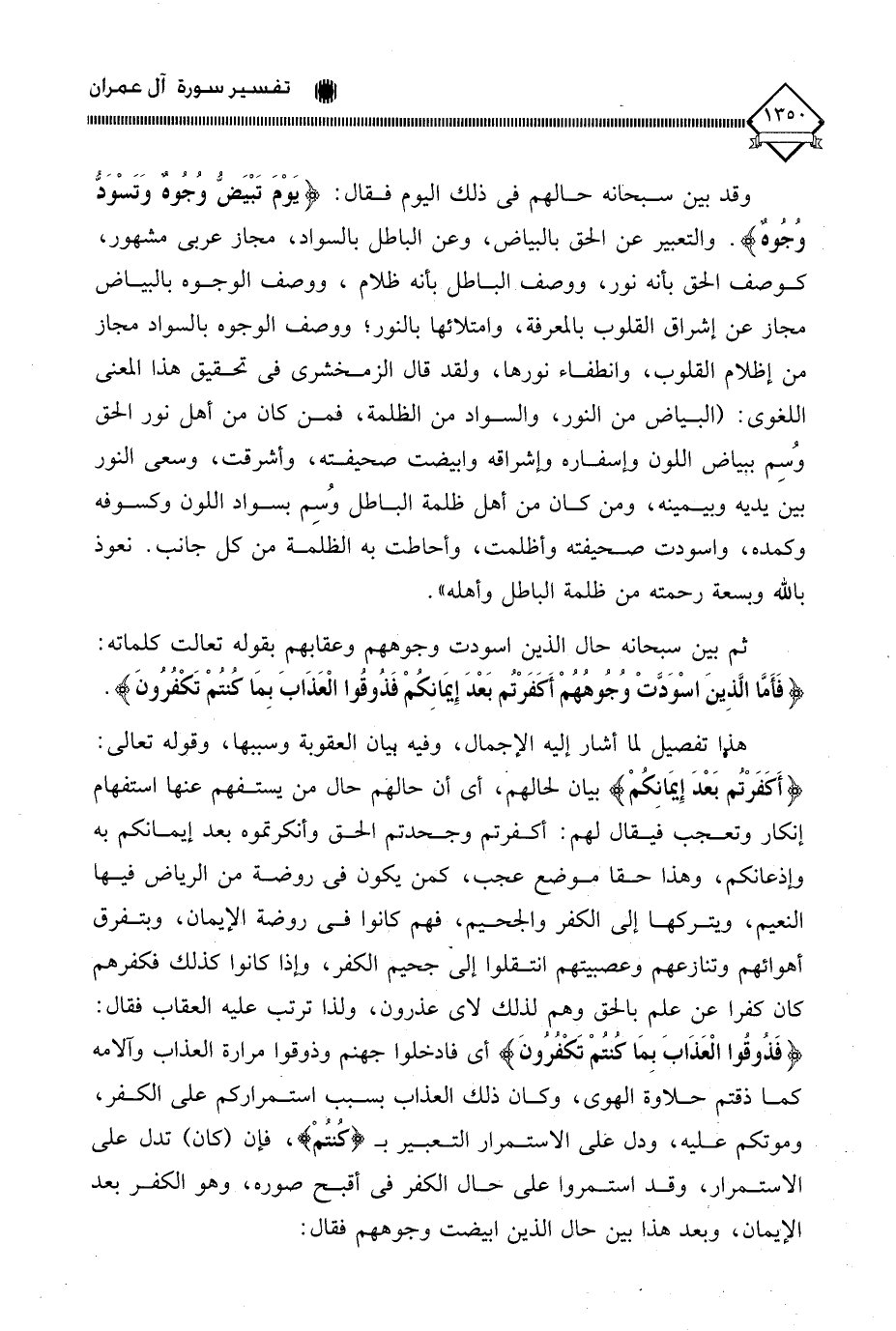 هذا تفصيل لما أشار إليه الإجمال، وفيه بيان العقوبة وسببها، وقوله تعالى: (أَكَفَرْتُم بَعْدَ إِيمَانِكُمْ) بيان لحالهم، أي أن حالهم حال من يستفهم عنها استفهام إنكار وتعجب فيقال لهم: أكفرتم وجحدتم الحق وأنكرتموه بعد إيمانكم به وإذعانكم، وهذا حقا موضع عجب، كمن يكون في روضة من الرياض فيها النعيم، ويتركها إلى الكفر والجحيم، فهم كانوا في روضة الإيمان، وبتفرق أهوائهم وتنازعهم وعصبيتهم انتقلوا إلى جحيم الكفر، وإذا كانوا كذلك فكفرهم كان كفرا عن علم بالحق وهم لذلك [لا يعذرون]، ولذا ترتب عليه العقاب فقال: (فَذُوقوا الْعَذَابَ بِمَا كُنتُمْ تَكفرُونَ) أي فادخلوا جهنم وذوقوا مرارة العذاب وآلامه كما ذقتم حلاوة الهوى، وكان ذلك العذاب بسبب استمراركم على الكفر، وموتكم عليه، ودل غلى الاستمرار التعبير بـ (كُنتُمْ)، فإن (كان) تدل على الاستمرار، وقد استمروا على حال الكفر في أقبح صوره، وهو الكفر بعد الإيمان، وبعد هذا بين حال الذين ابيضت وجوههم فقال: