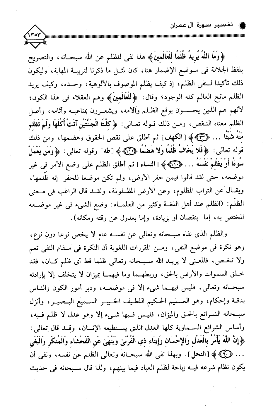 (وَمَا اللَّه يُرِيدُ ظُلْمًا لِّلْعَالَمِينَ) هذا نفي للظلم عن الله سبحانه، والتصريح بلفظ الجلالة في موضع الإضمار هنا، كان لمثل ما ذكرنا لتربية المهابة، وليكون ذلك تأكيدا لنفي الظلم، إذ كيف يظلم الموصوف بالألوهية، وحده، وكيف يريد الظلم مانح العالم كله الوجود؛ وقال: (لِلْعَالَمِينَ) وهم العقلاء في هذا الكون، لأنهم هم الذين يحسون بوقع الظلم وآلامه، ويشعرون بمتاعبه وآثامه، وأصل الظلم معناه النقص، ومن ذلك قوله تعالى: (كِلْتَا الْجَنَّتَيْنِ آتَتْ أُكلَهَا وَلَمْ تَظْلِم مِّنْهُ شَيْئًا. . .)، ثم أطلق على نقص الحقوق وهضمها، ومن ذلك قوله تعالى: (فَلا يَخَافُ ظُلْمًا وَلا هَضْمًا)، وقوله تعالى: (وَمَن يَعْمَلْ سُوءًا أَوْ يَظْلِمْ نَفْسَهُ. . .)، ثم أطلق الظلم على وضع الأمر في غير موضعه، حتى لقد قالوا فيمن حفر الأرض، ولم تكن موضعا للحفر إنه ظَلمها، ويقال عن التراب المظلوم، وعن الأرض المظلومة، ولقد قال الراغب في معنى الظلم: (الظلم عند أهل اللغة وكثير من العلماء: وضع الشيء في غير موضعه المختص به، إما بنقصان أو بزيادة، وإما بعدول عن وقته ومكانه). والظلم الذي نفاه سبحانه وتعالى عن نفسه عام لَا يخص نوعا دون نوع، وهو نكرة في موضع النفي، ومن المقررات اللغوية أن النكرة في مقام النفي تعم ولا تخص، فالمعنى لَا يريد الله سبحانه وتعالى ظلما قط أي ظلم كان، فقد خلق السماوات والأرض بالحق، وربطهما وما فيهما بميزان لَا يتخلف بإرادته سبحانه وتعالى، فليس فيهما شيء إلا في موضعه، ودبر أمور الكون والناس بدقة وإحكام، وهو العليم الحكيم اللطيف الخبير السميع البصير، وأنزل سبحانه الشرائع بالحق والميزان، فليس فيها شيء إلا وهو عدل لَا ظلم فيه، وأساس الشرائع السماوية كلها العدل الذي يستطيعه الإنسان، وقد قال تعالى: (إِنَّ اللَّهُ يَامُرُ بِالْعَدْلِ وَالإِحْسَانِ وَإِيتَاءِ ذِي الْقُرْبَى وَيَنْهَى عَنِ الْفَحْشَاءِ وَالْمُنكَرِ وَالْبَغْي. . .). وبهذا نفَى الله سبحانه وتعالى الظلم عن نفسه، ونفَى أن يكون نظام شرعه فيه إباحة لظلم العباد فيما بينهم، ولذا قال سبحانه في حديث