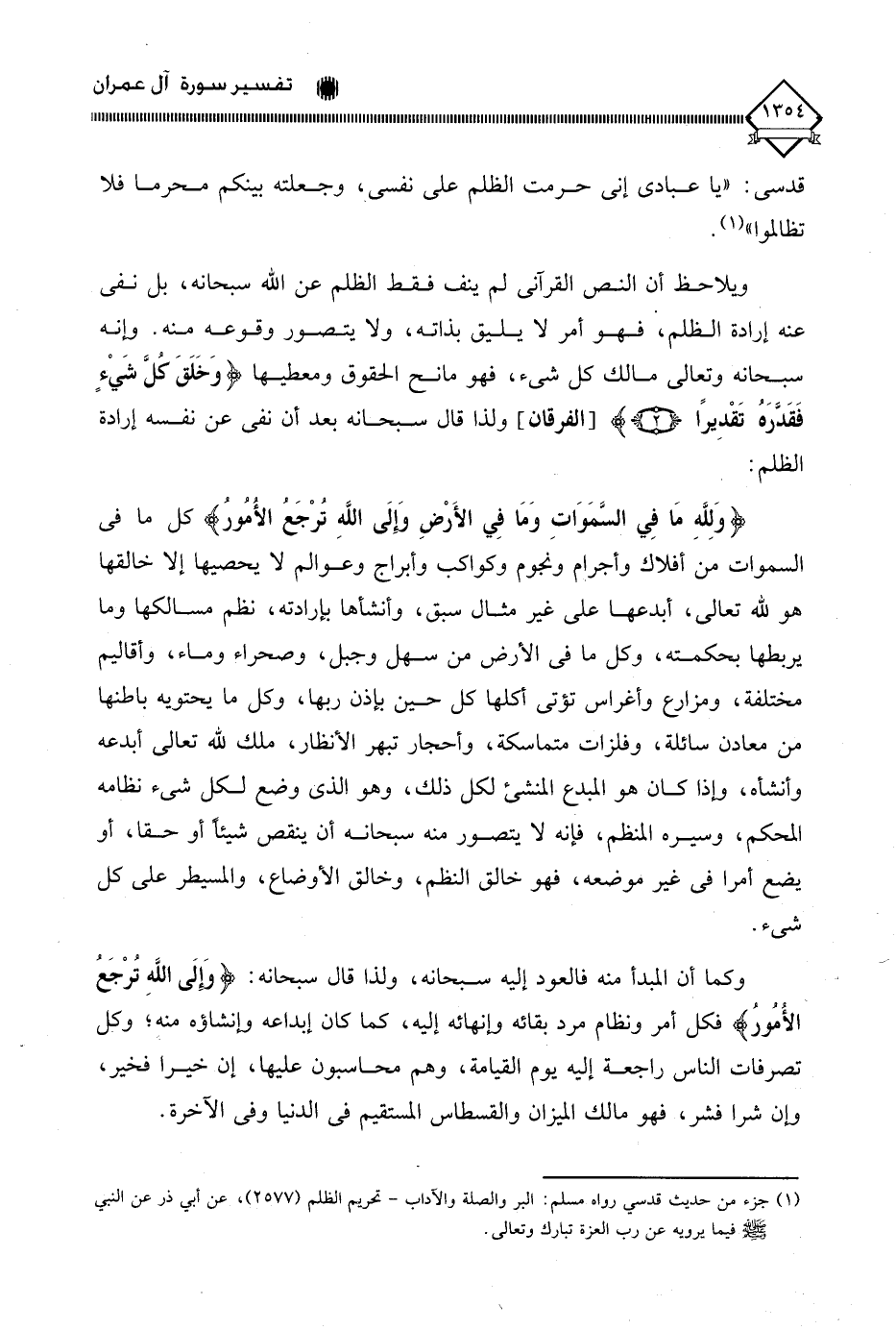 كل ما في السماوات من أفلاك وأجرام ونجوم وكواكب وأبراج وعوالم لَا يحصيها إلا خالقها هو لله تعالى، أبدعها على غير مثال سبق، وأنشأها بإرادته، نظم مسالكها وما يربطها بحكمته، وكل ما في الأرض من سهل وجبل، وصحراء وماء، وأقاليم مختلفة، ومزارع وأغراس تؤتي أكلها كل حين بإذن ربها، وكل ما يحتويه باطنها من معادن سائلة، وفلزات متماسكة، وأحجار تبهر الأنظار، ملك لله تعالى أبدعه وأنشأه، وإذا كان هو المبدع المنشئ لكل ذلك، وهو الذي وضع لكل شيء نظامه المحكم، وسيره النظم، فإنه لَا يتصور منه سبحانه أن ينقص شيئا أو حقا، أو يضع أمرا في غير موضعه، فهو خالق النظم، وخالق الأوضاع، والمسيطر على كل شيء.