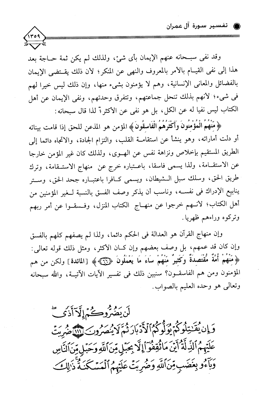 وقد نفَى سبحانه عنهم الإيمان بأي شيء، ولذلك لم يكن ثمة حاجة بعد هذا إلى نفي القيام بالأمر بالمعروف والنهي عن المنكر؛ لأن ذلك يقتضي الإيمان بالفضائل والمعاني الإنسانية، وهم لَا يؤمنون بشيء منها، وإن ذلك ليس خيرا لهم في شيء؛ لأنهم بذلك تنحل جماعتهم، وتتفرق وحدتهم، ونفي الإيمان عن أهل الكتاب ليس نفيا له عن الكل، بل هو نفي عن الأكثر؛ لذا قال سبحانه: (مِّنْهُمُ الْمُؤْمِنُونَ وَأَكْثَرُهُمُ الْفَاسِقُونَ) المؤمن هو المذعن للحق إذا قامت بيناته أو دلت أماراته، وهو ينشأ عن استقامة القلب، والتزام الجادة، والاتجاه دائما إلى الطريق المستقيم بإخلاص ونزاهة نفس عن الهوى، ولذلك كان غير المؤمن خارجا عن الاستقامة، ولذا يسمى فاسقا، باعتباره خرج عن منهاج الاستقامة، وترك طريق الحق، وسلك سبل الشيطان، ويسمى كافرا باعتباره جحد الحق، وستر ينابيع الإدراك في نفسه، وناسب أن يذكر وصف الفسق بالنسبة لغير المؤمنين من أهل الكتاب، لأنهم خرجوا عن منهاج الكتاب المنزل، وفسقوا عن أمر ربهم وتركوه وراءهم ظهريا.