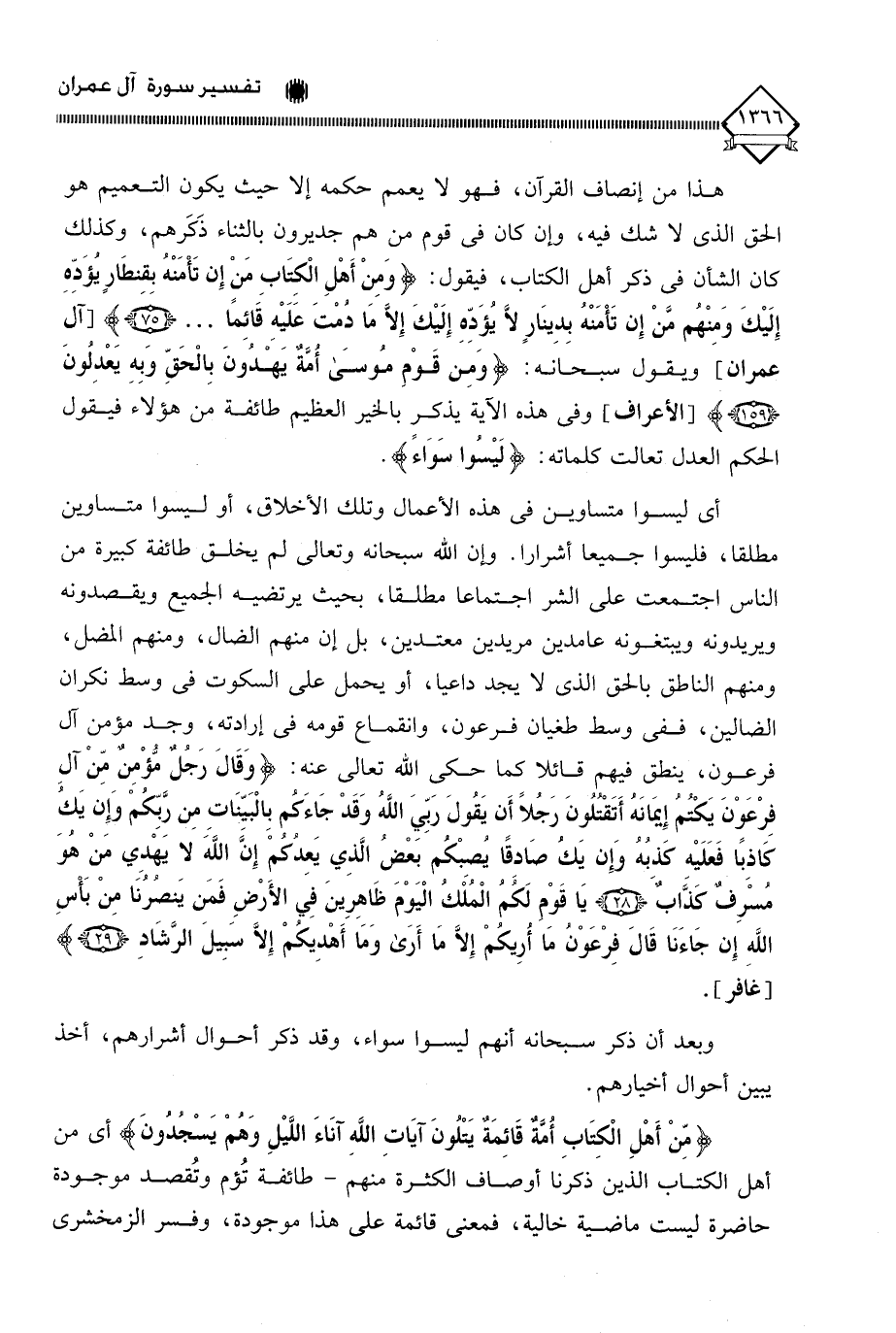 هذا من إنصاف القرآن، فهو لَا يعمم حكمه إلا حيث يكون التعميم هو الحق الذي لَا شك فيه، وإن كان في قوم من هم جديرون بالثناء ذَكَرهم، وكذلك كان الشأن في ذكر أهل الكتاب، فيقول: (وَمِنْ أَهْلِ الْكِتَابِ مَنْ إِن تَأْمَنْهُ بقنطَارٍ يُؤَدِّهِ إِلَيْكَ وَمِنْهُم مَّنْ إِن تَأْمَنْهُ بِدِينَارٍ لَا يُؤَدِّهِ إِلَيْكَ إِلَّا مَا دُمْتَ عَلَيْهِ قَائِمًا. . .).