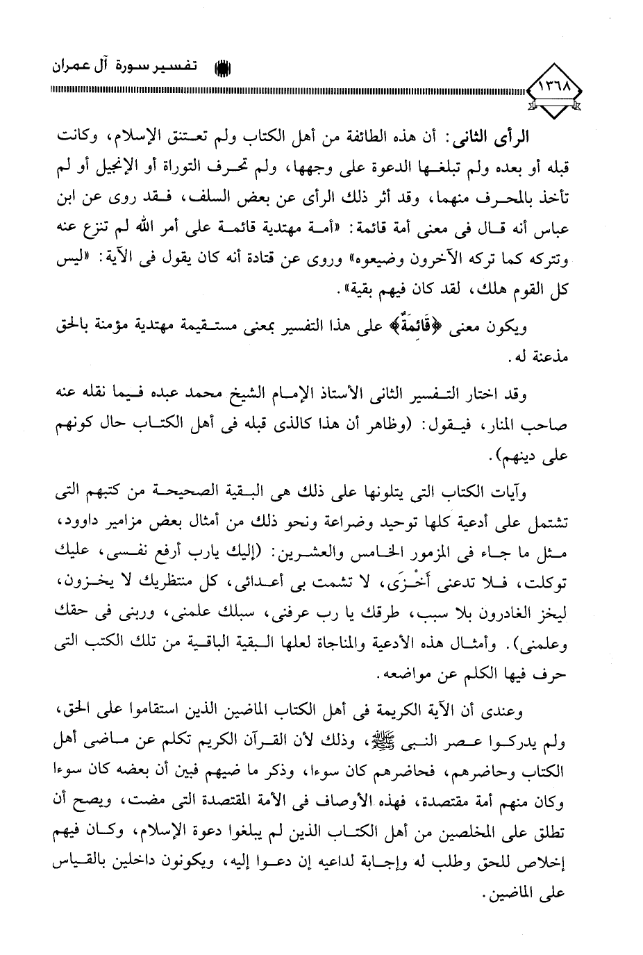 وقد اختار التفسير الثاني الأستاذ الإمام الشيخ محمد عبده فيما نقله عنه صاحب المنار، فيقول: (وظاهر أن هذا كالذي قبله في أهل الكتاب حال كونهم على دينهم).