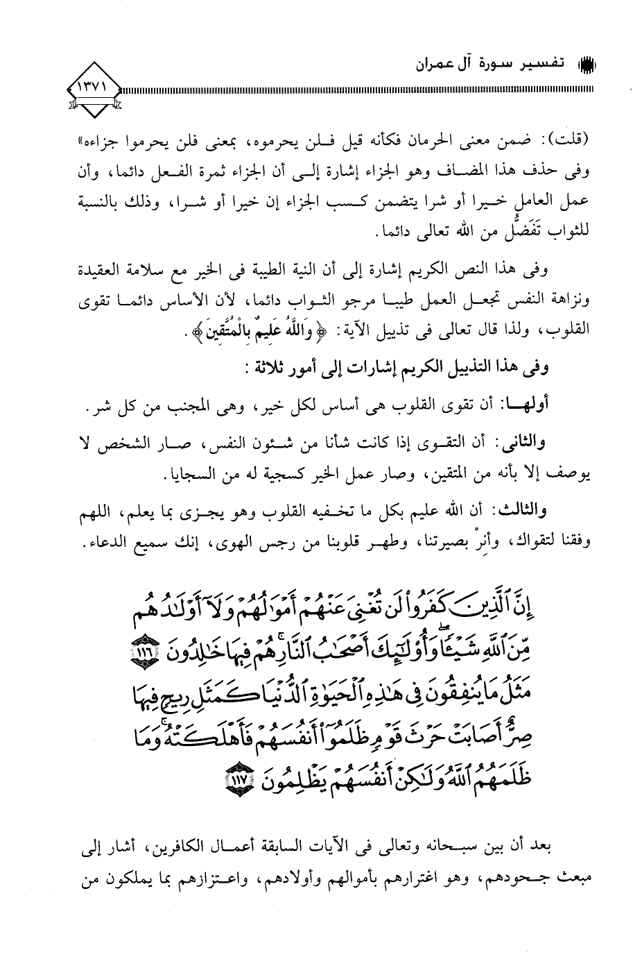(إِنَّ الَّذِينَ كَفَرُوا لَنْ تُغْنِيَ عَنْهُمْ أَمْوَالُهُمْ وَلَا أَوْلَادُهُمْ مِنَ اللَّهِ شَيْئًا وَأُولَئِكَ أَصْحَابُ النَّارِ هُمْ فِيهَا خَالِدُونَ (116) مَثَلُ مَا يُنْفِقُونَ فِي هَذِهِ الْحَيَاةِ الدُّنْيَا كَمَثَلِ رِيحٍ فِيهَا صِرٌّ أَصَابَتْ حَرْثَ قَوْمٍ ظَلَمُوا أَنْفُسَهُمْ فَأَهْلَكَتْهُ وَمَا ظَلَمَهُمُ اللَّهُ وَلَكِنْ أَنْفُسَهُمْ يَظْلِمُونَ (117)