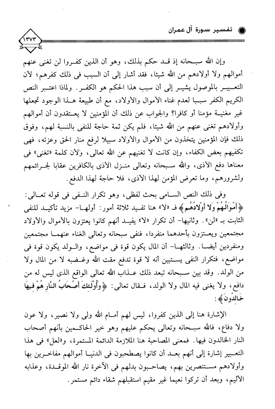 وفى ذلك النص السامي بحث لفظي، وهو تكرار النفي في قوله تعالى: (أَمْوَالُهُمْ وَلا أَوْلادُهُم) فـ " لا " هنا تفيد ثلاثة أمور: أولها - مزيد تأكيد للنفي الثابت بـ " لن ". وثانيها - أن تكرار " لا " يفيد أنهم كانوا يعتزون بالأموال والأولاد مجتمعين ويعتزون بأحدهما منفردا، فنفَى سبحانه وتعالى الغناء عنهما مجتمعين ومنفردين أيضا. وثالثها - أن المال يكون قوة في مواضع، والولد يكون قوة في مواضع، فتكرار النفي يستبين أنه لَا قوة تدفع مقت الله وغضبه لَا من المال ولا من الولد. وقد بين سبحانه تبعد ذلك عذاب الله تعالى الواقع الذي ليس له من دافع، ولا يغني فيه المال ولا الولد، فقال تعالى: (وَأُولَئِكَ أَصْحَابُ النَّارِ هُمْ فِيهَا خَالِدُونَ):