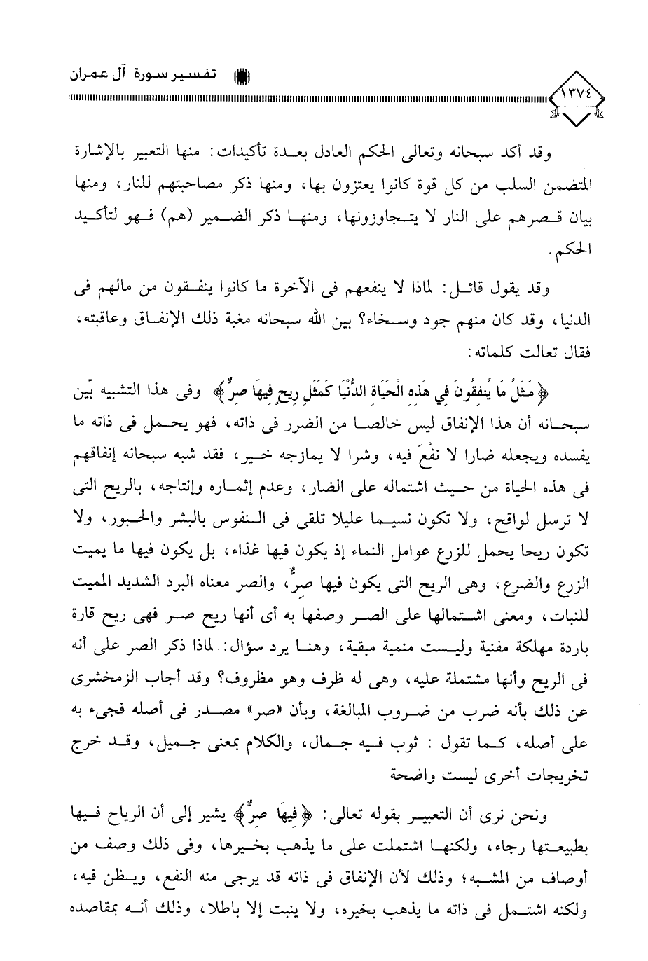 وفي هذا التشبيه بّين سبحانه أن هذا الإنفاق ليس خالصا من الضرر في ذاته، فهو يحمل في ذاته ما يفسده ويجعله ضارا لَا نفْعَ فيه، وشرا لَا يمازجه خير، فقد شبه سبحانه إنفاقهم في هذه الحياة من حيث اشتماله على الضار، وعدم إثماره وإنتاجه، بالريح التي لا ترسل لواقح، ولا تكون نسيما عليلا تلقي في النفوس بالبشر والحبور، ولا تكون ريحا يحمل للزرع عوامل النماء إذ يكون فيها غذاء، بل يكون فيها ما يميت الزرع والضرع، وهي الريح التي يكون فيها صِرٌّ، والصر معناه البرد الشديد المميت للنبات، ومعنى اشتمالها على الصر وصفها به أي أنها ريح صر فهي ريح قارة باردة مهلكة مفنية وليست منمية مبقية، وهنا يرد سؤال: لماذا ذكر الصر على أنه في الريح وأنها مشتملة عليه، وهي له ظرف وهو مظروف؟ وقد أجاب الزمخشري عن ذلك بأنه ضرب من ضروب المبالغة، وبأن " صر " مصدر في أصله فجيء به على أصله، كما تقول: ثوب فيه جمال، والكلام بمعنى جميل، وقد خرج تخريجات أخرى ليست واضحة.