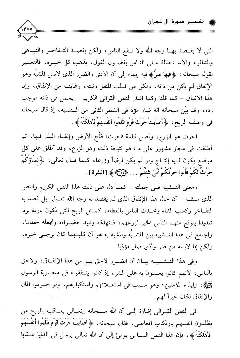 التي لَا يقصد بها وجه الله ولا نفع الناس، ولكن يقصد التفاخر والتباهي والتنافر، والاستطالة على الناس بفضول القول، يذهب كل خيره، فالتعبير بقوله سبحانه: (فِيهَا صِرٌّ) فيه إيماء إلى أن الأذى والضرر الذي لابس المشبَّه وهو الإنفاق لم يكن من ذاته، ولكن من قلب المنفق ونينه، وغايته من الإنفاق، وإن هذا الإنفاق - كما قلنا وكما أشار النص القرآني الكريم - يحمل في ذاته موجب رده، وقد بيّن سبحانه أنه ضار مؤذ في الشطر الثاني من التشبيه، إذ قال سبحانه في وصف الريح: (أَصَابَتْ حَرْثَ قَوْم ظَلَمُوا أَنفُسَهُمْ فَأهْلَكَتْهُ).