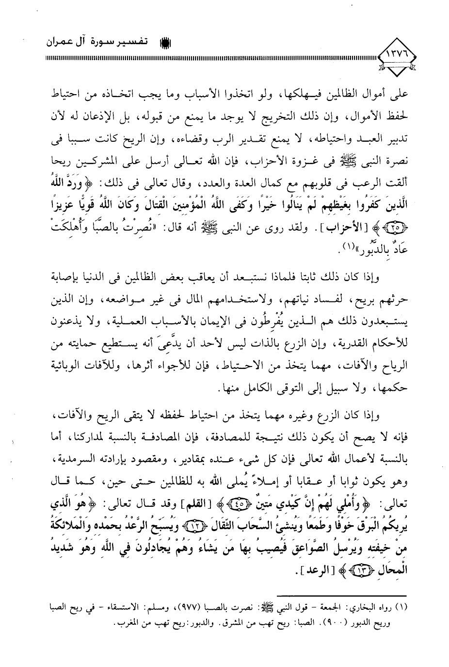 على أموال الظالمين فيهلكها، ولو اتخذو لأسباب وما يجب اتخاذه من احتياط لحفظ الأموال، وإن ذلك التخريج لَا يوجد ما يمنع من قبوله، بل الإذعان له لأن تدبير العبد واحتياطه، لَا يمنع تقدير الرب وقضاءه، وإن الريح كانت سببا في نصرة النبي - صلى الله عليه وسلم - في غزوة الأحزاب، فإن الله تعالى أرسل على المشركين ريحا ألقت الرعب في قلوبهم مع كمال العدة والعدد، وقال تعالى في ذلك: (وَرَدَّ اللَّهُ الَّذينَ كَفَرُوا بِغَيْظِهِمْ لَمْ يَنَالُوا خَيْرًا وَكَفَى اللَّهُ الْمُؤْمِنِينَ الْقِتَالَ وَكَانَ اللَّهُ قَوِيًّا عَزِيزًا). ولقد روي عن النبي - صلى الله عليه وسلم - أنه قال: " نُصِرْتُ بالصَّبَا وَأُهْلكَتْ عَاد بِالدَّبور " (¬1).