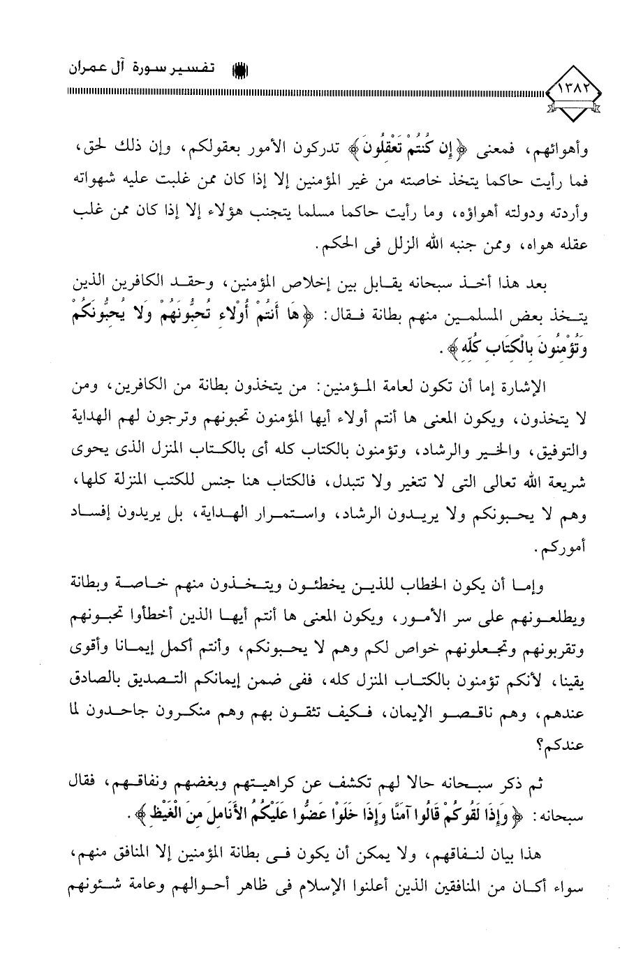وأهوائهم، فمعنى (إِن كنتُمْ تَعْقِلُونَ) تدركون الأمور بعقولكم، وإن ذلك لحق، فما رأيت حاكما يتخذ خاصته من غير المؤمنين إلا إذا كان ممن غلبت عليه شهواته وأردته ودولته أهواؤه، وما رأيت حاكما مسلما يتجنب هؤلاء إلا إذا كان ممن غلب عقله هواه، وممن جنبه الله الزلل في الحكم.
