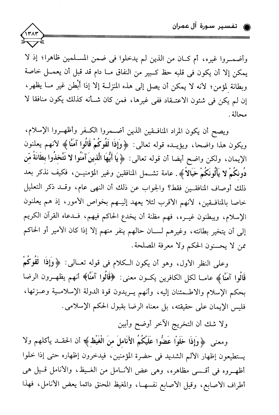 ويصح أن يكون المراد المنافقين الذين أضمروا الكفر وأظهروا الإسلام، ويكون هذا واضحا، ويؤيده قوله تعالى: (وَإِذَا لَقوكُمْ قَالُوا آمَنَّا) لأنهم يعلنون الإيمان، ولكن واضح أيضا أن قوله تعالى: (يَا أَيّهَا الَّذِينَ آمَنُوا لَا تَتَّخِذُوا بِطَانَةً مِّن دُونِكُمْ لَا يَأْلُونَكُمْ خَبَالًا). عامة تشمل المنافقين وغير المؤمنين، فكيف نذكر بعد ذلك أوصاف المنافقين فقط؟ والجواب عن ذلك أن النهي عام، وقد ذكر التعليل خاصا بالمنافقين، لأنهم الأقرب لئلا يعهد إليهم بخواص الأمور، إذ هم يعلنون الإسلام، ويبطنون غيره، فهم مظنة أن يخدع الحاكم فيهم، فدعاه القرآن الكريم إلى أن يتخير بطانته، وغيرهم لسان حالهم ينفر منهم إلا إذا كان الأمير أو الحاكم ممن لَا يحسنون الحكم ولا معرفة المصلحة.