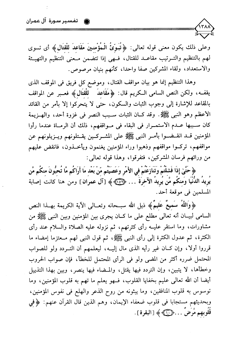 وهذا التنظيم إنما هو بيان مواقف القتال، وموضع كل فريق في الموقف الذي يقفه، ولكن النص السامي الكريم قال: (مَقَاعِدَ لِلْقِتَالِ) فعبر عن المواقف بالمقاعد للإشارة إلى وجوب الثبات والسكون، حتى لَا يتحركوا إلا بأمر من القائد الأعظم وهو النبي - صلى الله عليه وسلم -. وقد كان الثبات سبب النصر في غزوة أحد، والهزيمة كان سببها عدم الاستمرار في البقاء في مواقفهم، ذلك أن الرماة عندما رأوا المؤمنين قد انقضوا بأمر النبي - صلى الله عليه وسلم - على المشركين يقتلونهم ويزيلونهم عن مواقفهم، تركوا مواقفهم وذهبوا وراء المؤمنين يغنمون ويأخذون، فانقض عليهم من ورائهم فرسان المشركين، فتفرقوا، وهذا قوله تعالى: