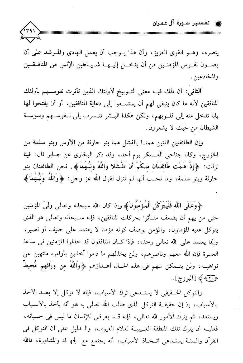 وإن الطائفتين اللتين همتا بالفشل هما بنو حارثة من الأوس وبنو سلمة من الخزرج، وكانا جناحي العسكر يوم أحد، وقد ذكر البخاري عن جابر قال: فينا نزلت: (إِذْ هَمَّت طَائِفَتَانِ مِنكُمْ أَن تَفْشَلا وَاللَّهُ وَلِيُّهُمَا). نحن الطائفتان بنو حارثة وبنو سلمة، وما نحب أنها لم تنزل لقول الله عز وجل: (وَاللَّهُ وَلِيُّهُمَا) (وَعَلَى اللَّهِ فَلْيَتَوَكَّلِ الْمُؤْمِنُونَ) وإذا كان الله سبحانه وتعالى وليّ المؤمنين حتى من يهم أن يضعف متأثرا بحركات المنافقين، فإنه سبحانه وتعالى هو الذي يتوكل عليه المؤمنون، والمؤمن بوصف كونه مؤمنا لَا يعتمد على حليف أو نصير، وإنما يعتمد على الله تعالى وحده، فإذا كان المنافقون قد خذلوا المؤمنين في ساعة العسرة فإن الله معهم وناصرهم، ولن يخذلهم ما داموا آخذين بأوامره منتهين عن نواهيه، ولن يتمكن منهم في هذه الحال أعداؤهم (وَاللَّهُ مِن وَرَائِهِم مُّحِيط).
