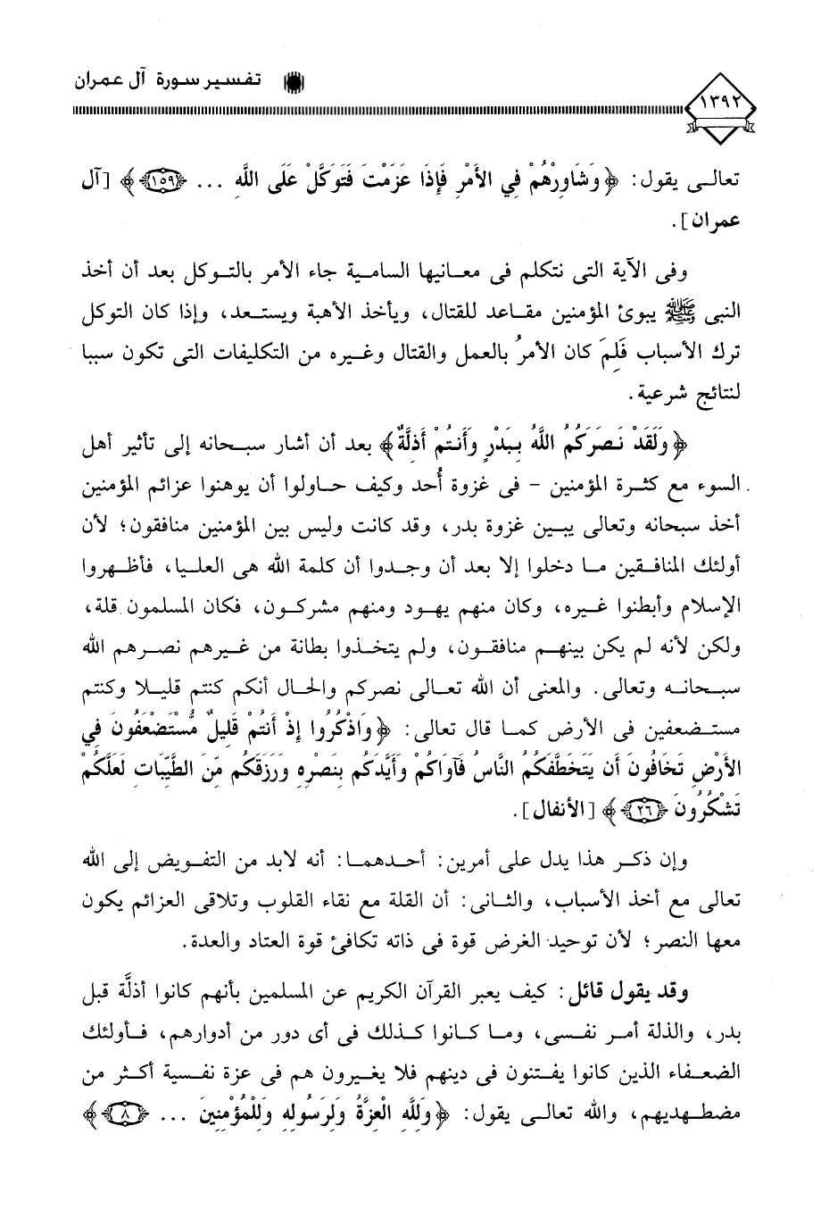 وإن ذكر هذا يدل على أمرين: أحدهما: أنه لابد من التفويض إلى الله تعالى مع أخذ الأسباب، والثاني: أن القلة مع نقاء القلوب وتلاقي العزائم يكون معها النصر، لأن توحيد الغرض قوة في ذاته تكافئ قوة العتاد والعدة، وقد - يقول قائل: كيف يعبر القرآن الكريم عن المسلمين بأنهم كانوا أذلَّة قبل بدر، والذلة أمر نفسي، وما كانوا كذلك في أي دور من أدوارهم، فأولئك الضعفاء الذين كانوا يفتنون في دينهم فلا يغيرون هم في عزة نفسية أكثر من مضطهديهم، والله تعالى يقول: (وَلِلَّهِ الْعِزَّةُ وَلِرَسُولِهِ وَلِلْمُؤْمِنِينَ. . .).