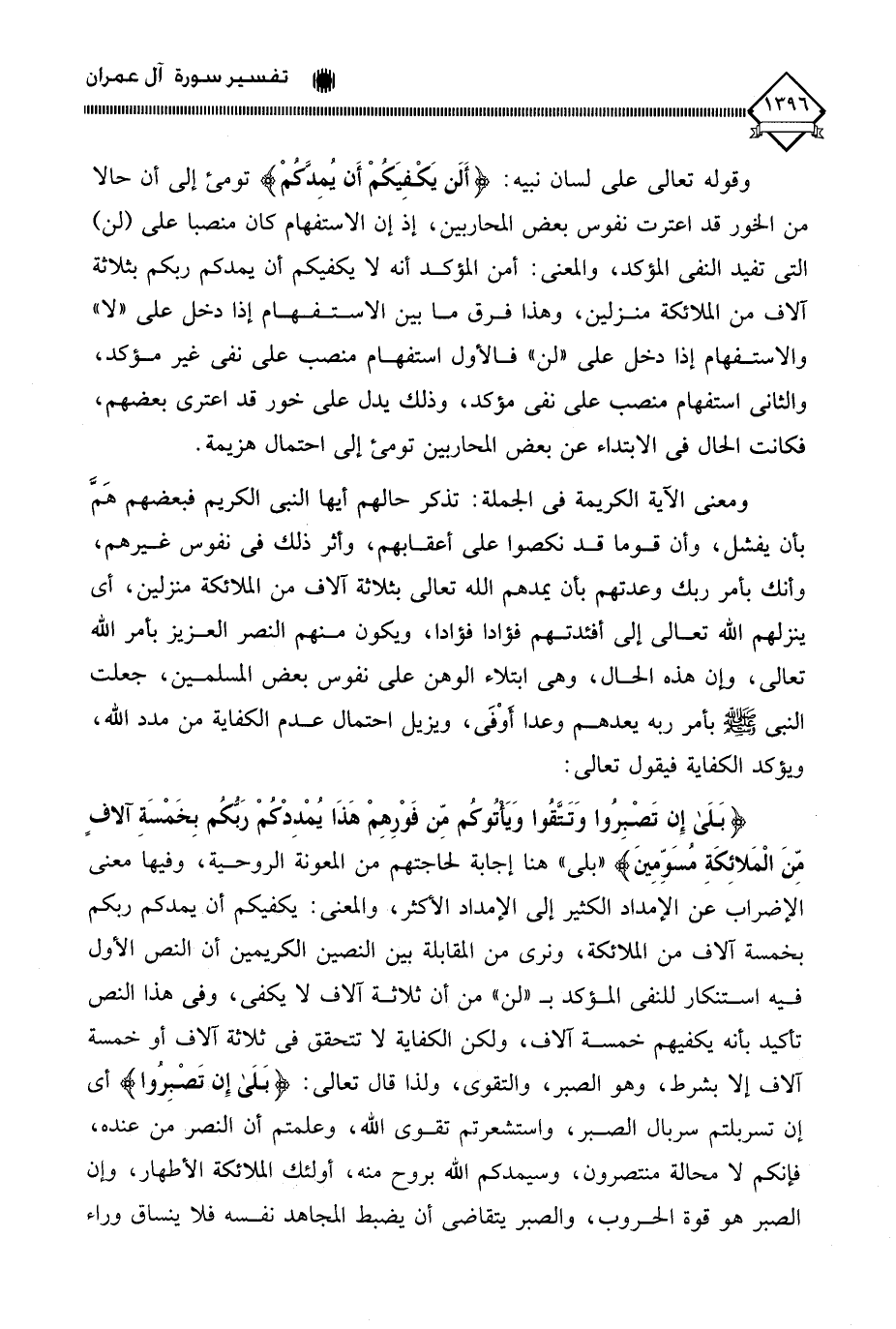" بلى " هنا إجابة لحاجتهم من المعونة الروحية، وفيها معنى الإضراب عن الإمداد الكثير إلى الإمداد الأكثر، والمعنى: يكفيكم أن يمدكم ربكم بخمسة آلاف من الملائكة، ونرى من المقابلة بين النصين الكريمين أن النص الأول فيه استنكار للنفي المؤكدب " لن " من أن ثلاثة آلاف لَا يكفي، وفي هذا النص تأكيد بأنه يكفيهم خمسة آلاف، ولكن الكفاية لَا تتحقق في ثلاثة آلاف أو خمسة آلاف إلا بشرط، وهو الصبر، والتقوى، ولذا قال تعالى: (بَلَى إِن تَصْبِرُوا) أي إن تسربلتم سربال الصبر، واستشعرتم تقوى الله، وعلمتم أن النصر من عنده، فإنكم لَا محالة منتصرون، وسيمدكم الله بروح منه، أولئك الملائكة الأطهار، وإن الصبر هو قوة الحروب، والصبر يتقاضى أن يضبط المجاهد نفسه فلا ينساق وراء